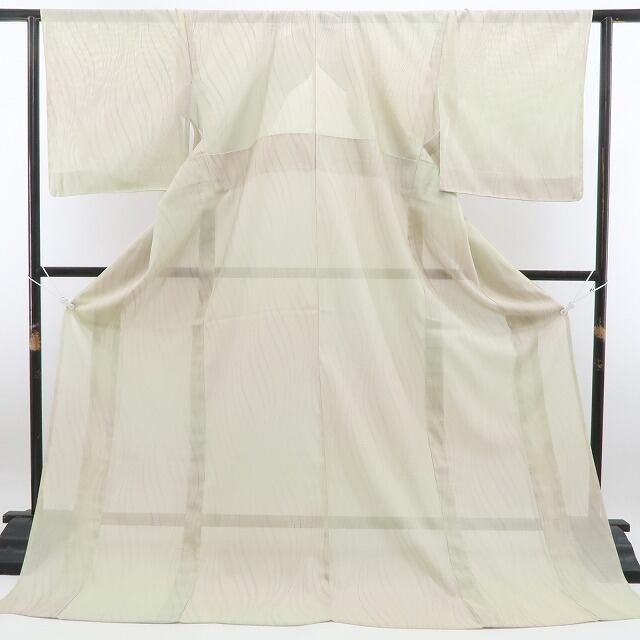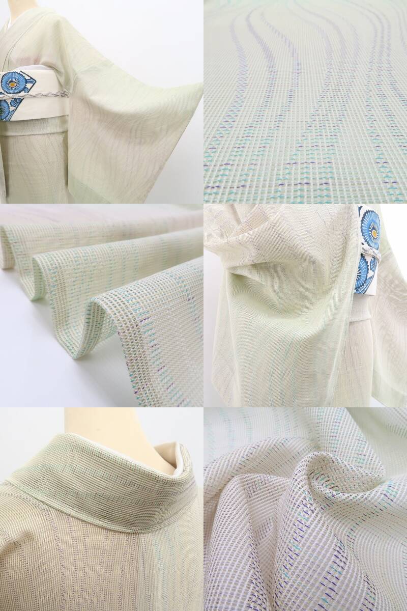 生地には、透け感が美しい「紗」を使用。二本の経糸で緯糸をからめて織る“もじり織”ならではの繊細な風合いで、絽よりもさらに涼感のある素材です。7〜8月の盛夏はもちろん、近しい色味の襦袢と合わせれば、単衣の季節(6月・9月)にもお召しいただけます。