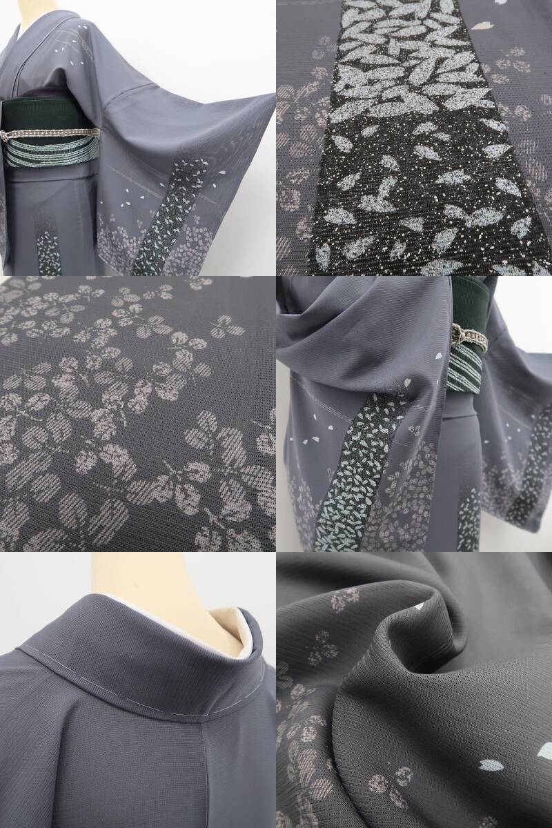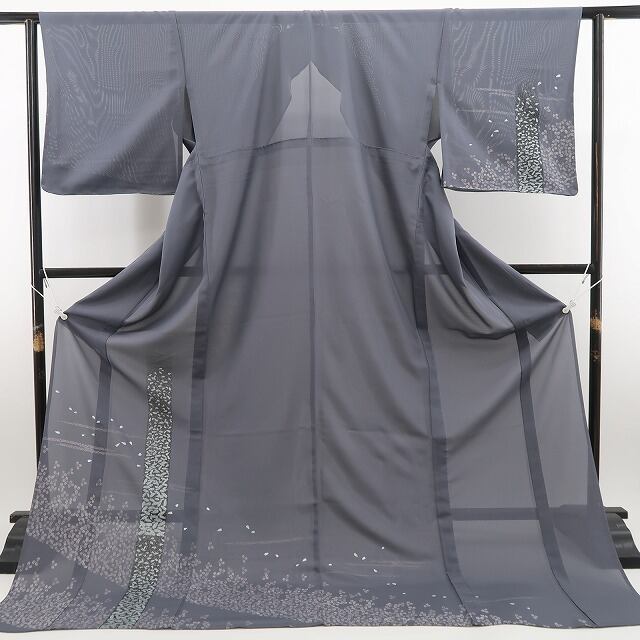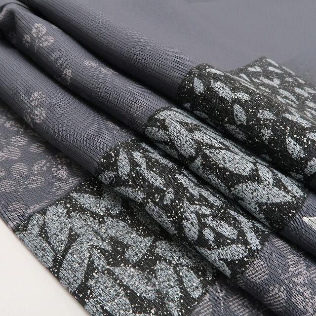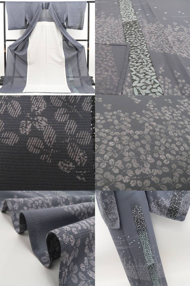 絽の透明感に藍墨茶色の彩りが放つこの上ない大人びた艶、巧みな構図で浮かび上がるデザイン花葉の艶模様、そして慎ましくも視覚のインパクトを残す桜散らしのデザインモチーフ、どれを取っても創作物ならではの洗練性が光るひと品…優雅な趣に込められた奥深い和の感性を存分にお感じいただけることでしょう。