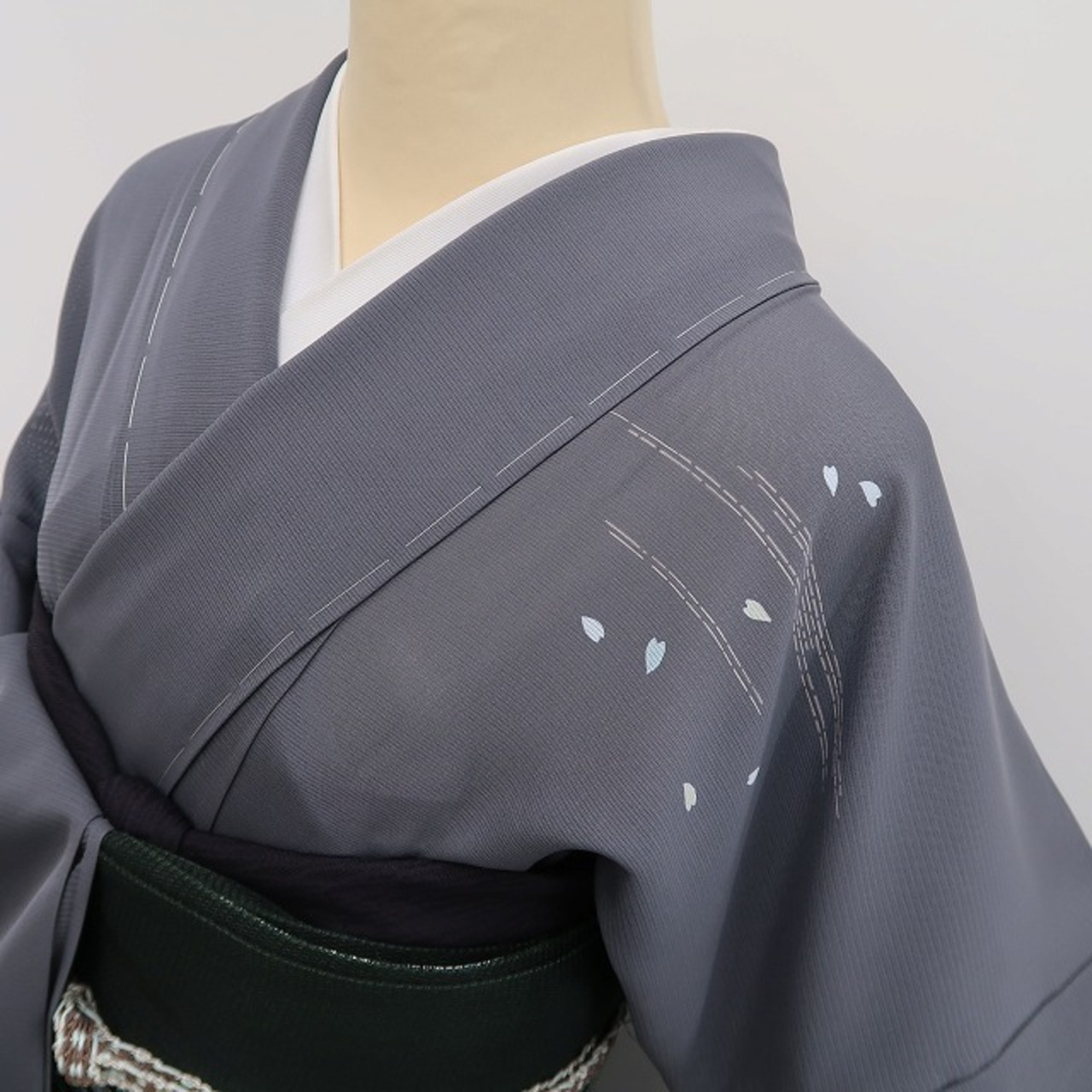 こちらのお着物は、グレイッシュトーンの彩色で意匠の美しさにフォーカスしたデザイン性の高い柄行を込めております。過飾にならず、さりげない大人のセンスを表現するのに最適、弊社にて反物より丁寧に仕立てたお品でございます。