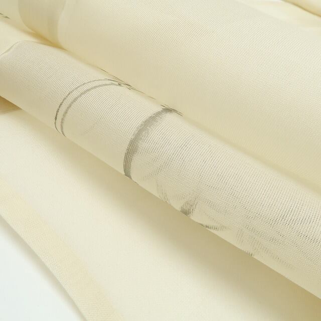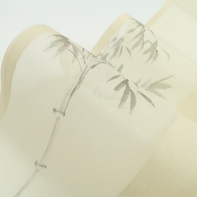 丸み帯びた浅黄色の地にまるで日本画のように描き込まれた笹竹のデザインモチーフ、それは紗の透明感に心地よいインパクトを残す素敵な風の贈り物、高級絹糸が創り出す唯一無二の自然な風合いは正に夏芭蕉ならでは。
