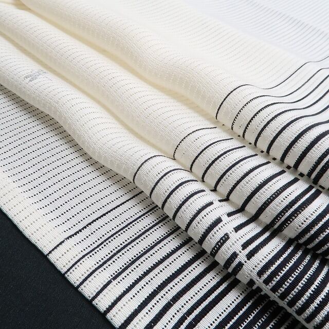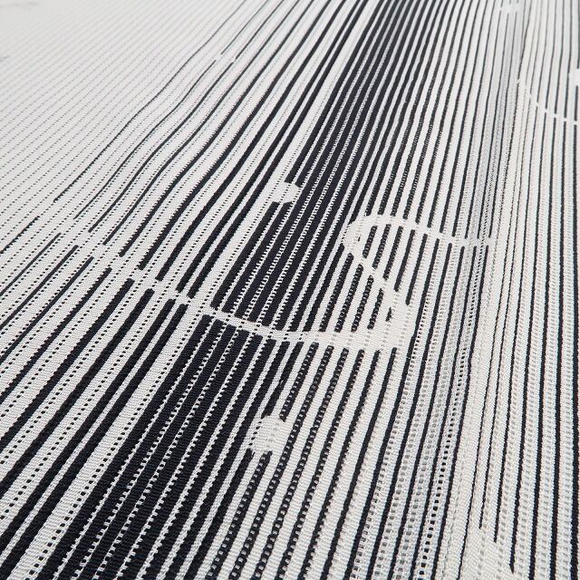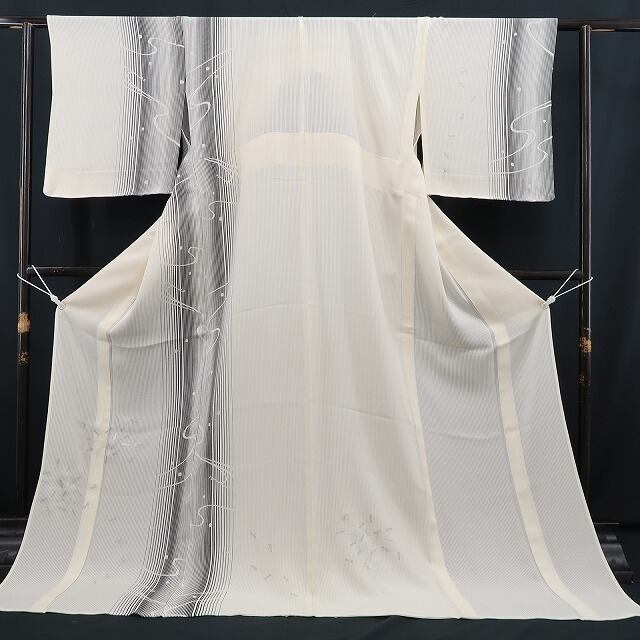 生成り色と黒のコントラストで引かれた不統一なデザインライン、縦縞の構図に飛び交う夏の風物“トンボの風情”、絽の透明感に巧みな意匠が醸し出すえも言われぬお洒落感!“人それぞれに想いを巡らす記憶の先の夏トンボ”、これぞ!創作着物の奥行そのもの、お奨めです。