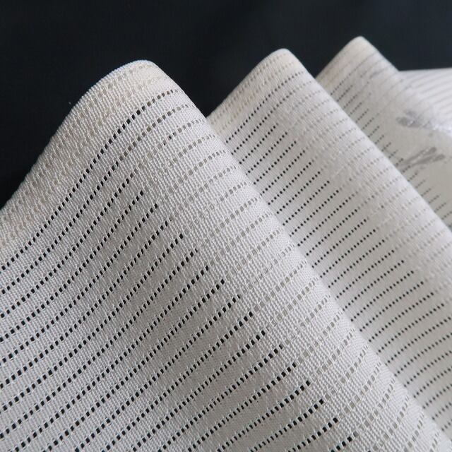 絽のお着物は、二本の経糸を捩りながら緯糸を織り込んだもじり織で、盛夏のお召し物として涼しげでさらりとした生地質が魅力、着る方にもまた見る方にも清らかな風を感じるような涼しさを届けてくれます。また、絽は、絽目の違いによりヨコに目を通した横絽と、タテに通した堅(縦)絽に分けられます。タテ糸とヨコ糸を交互に絡み合わせて組織するのが平絽、駒撚りに糸で織り上げた絽を駒絽といいます。駒絽は平絽より、しっかりとした手触りで現在の絽の多くがこれにあたります。
