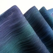 藍色・納戸色等で流線と共にほんのりと空や海、草木や花を想像させるミステリアスな虹を架け、その見る者を惹きつけもっともっと知りたくなる美しさには、なみなみと沸き立つ涼気が忍び、貴女を夏のオアシスへと誘います。また袖を通せば、その美しさが変幻自在に動き出し、まるでその世界を操っているかのよう...。