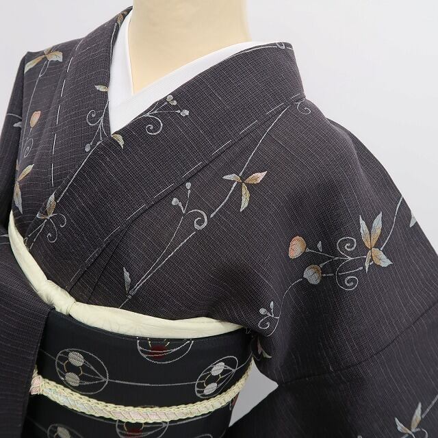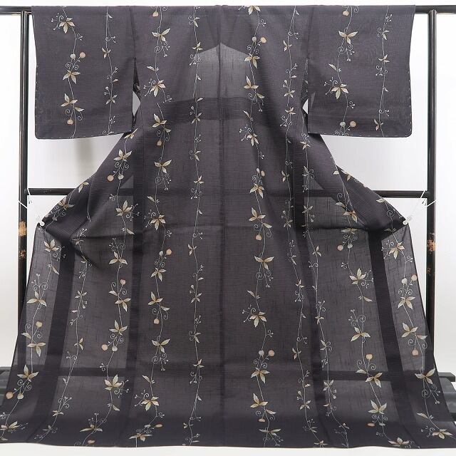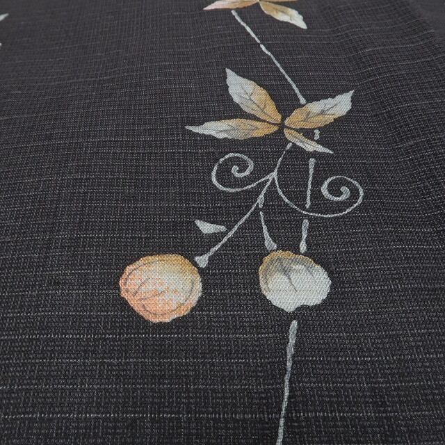 黒橡色の地に縦に連なるフウセンカズラがあしらわれた、紬のお着物でございます。