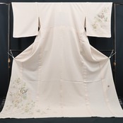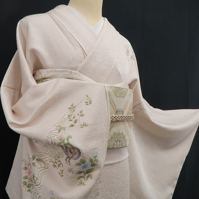 灰桜色のやわらかな地に、花々と流水、そして鳳凰が雅やかに描かれた訪問着。