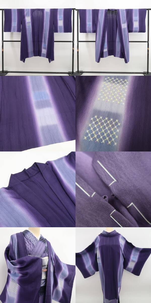 涼味を秘めた本紫色の高貴な雰囲気で視覚も心も酔わせ、淡い光が射すかのように連なり、刺繍で吹き込んだ星のような花で繋ぐ菱柄が目を引く竹が現われ、何か物語が始まりそうな抱擁を届ける一枚。