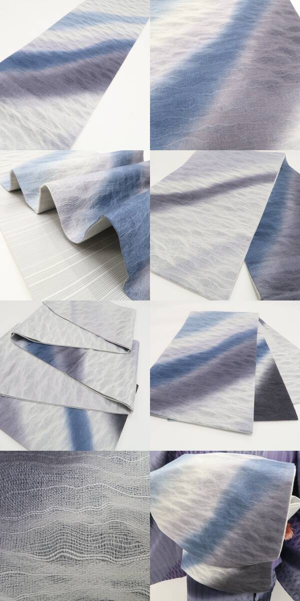 白磁色×紺色×藤納戸色で解く、どこかミステリアスに薫る流れが水中に隠れ、ゆらゆら波打つ水面にほのかに薫り立つような美を織る一本は、撮影のために一度締めましたが、ほとんど使用感はございません。
