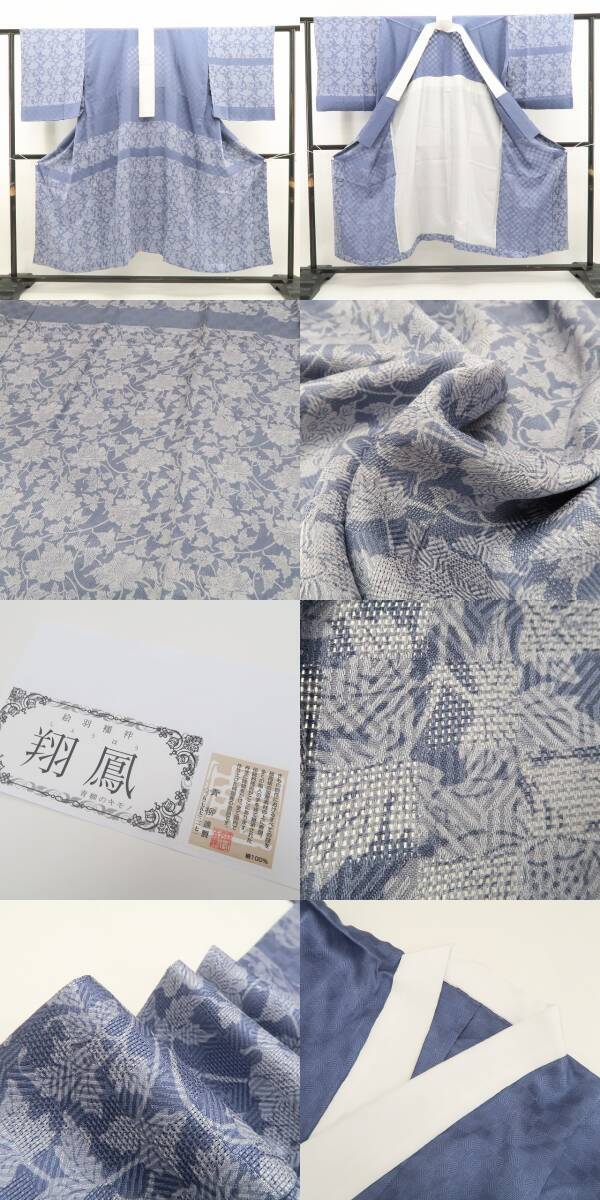 品のある群青色で美しい透け感に柄を持つ紋紗の魅力を活かして唐花を涼し気に満たし、着物を汚れから守り、隠れる所でもありますが衿や袖口からちらりと覗く瞬間も花咲かせる一枚は、少々の衿擦れのみの「美品」。