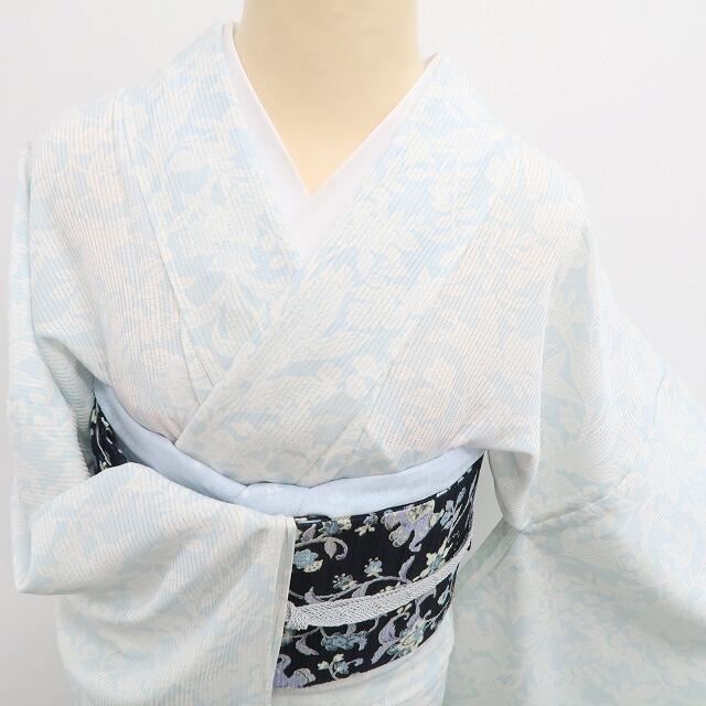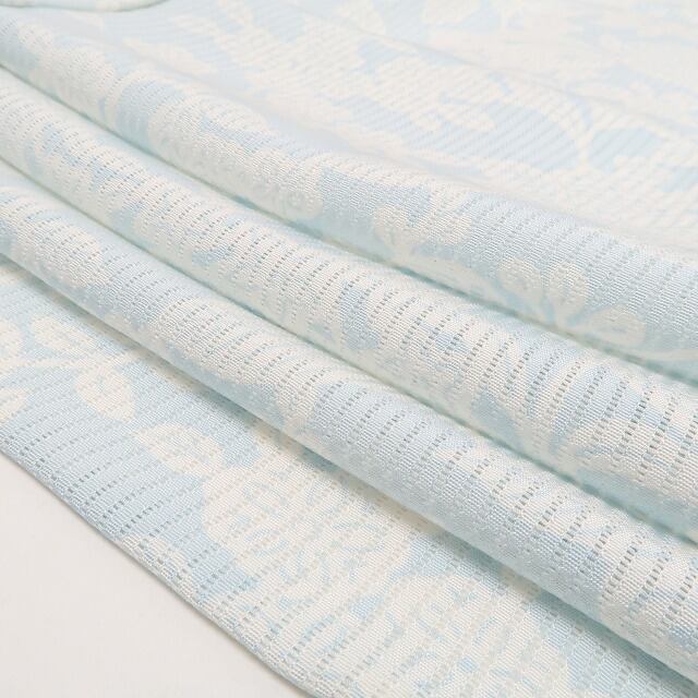 すっきりとした縦絽に柔らかな白の花模様が舞い、軽やかに涼を運んでくれます。