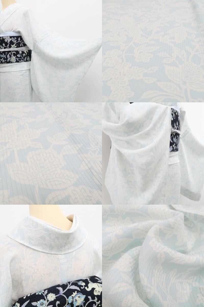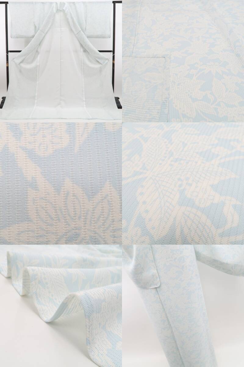 水色の絽地に、白であしらわれた唐花が爽やかな風を運ぶ小紋。トールサイズ、当社お仕立て上がり品でございます。