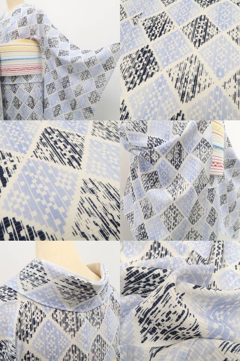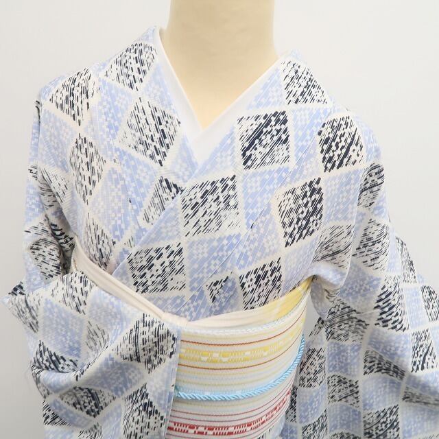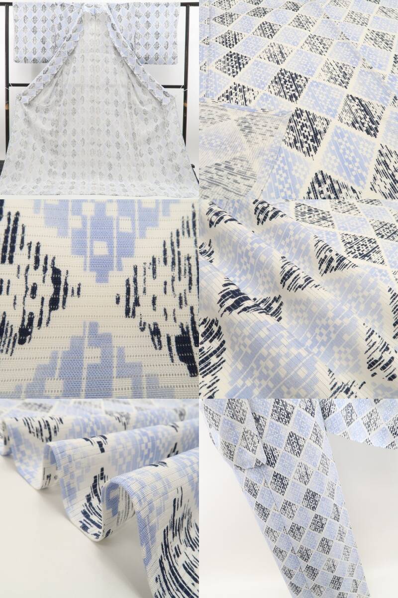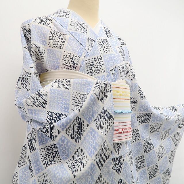 白×藍鉄色×青藤色の爽やかな色合いで構成された、ダイヤのような印象的な紋様。