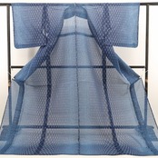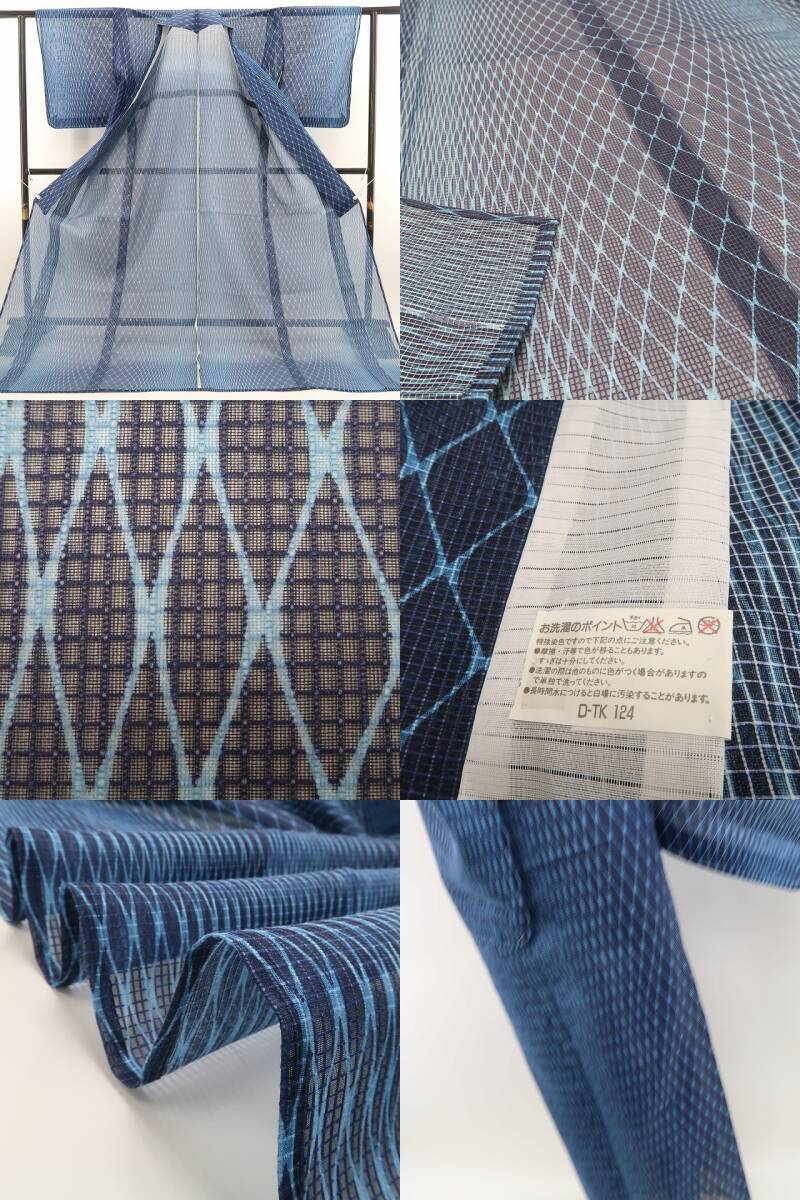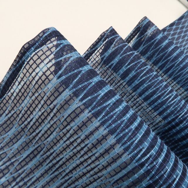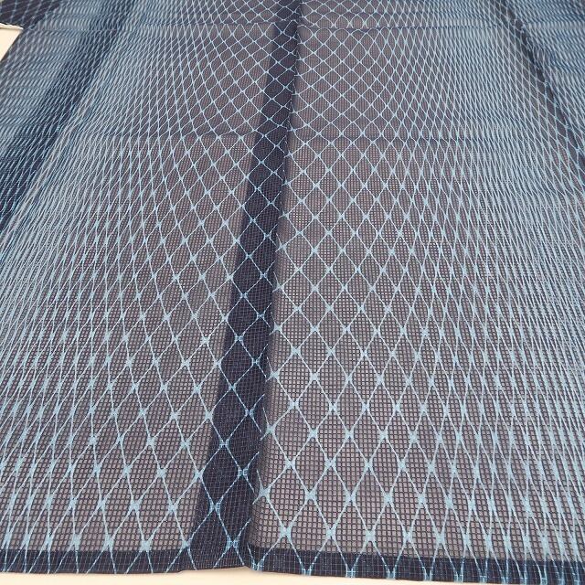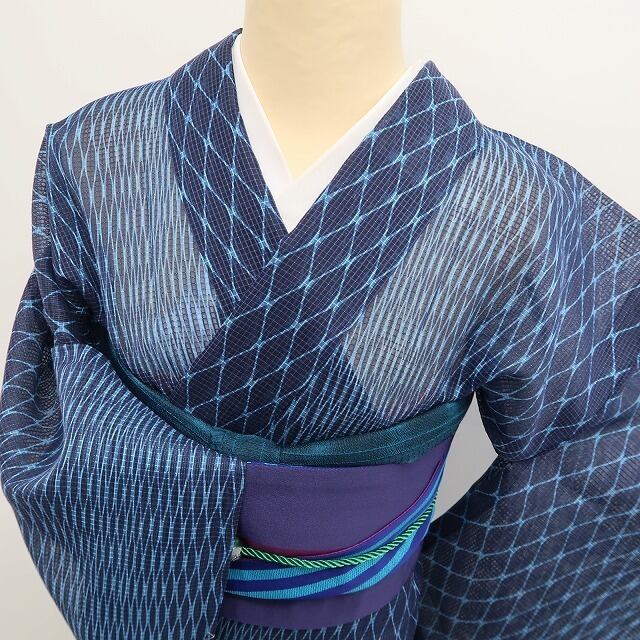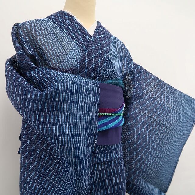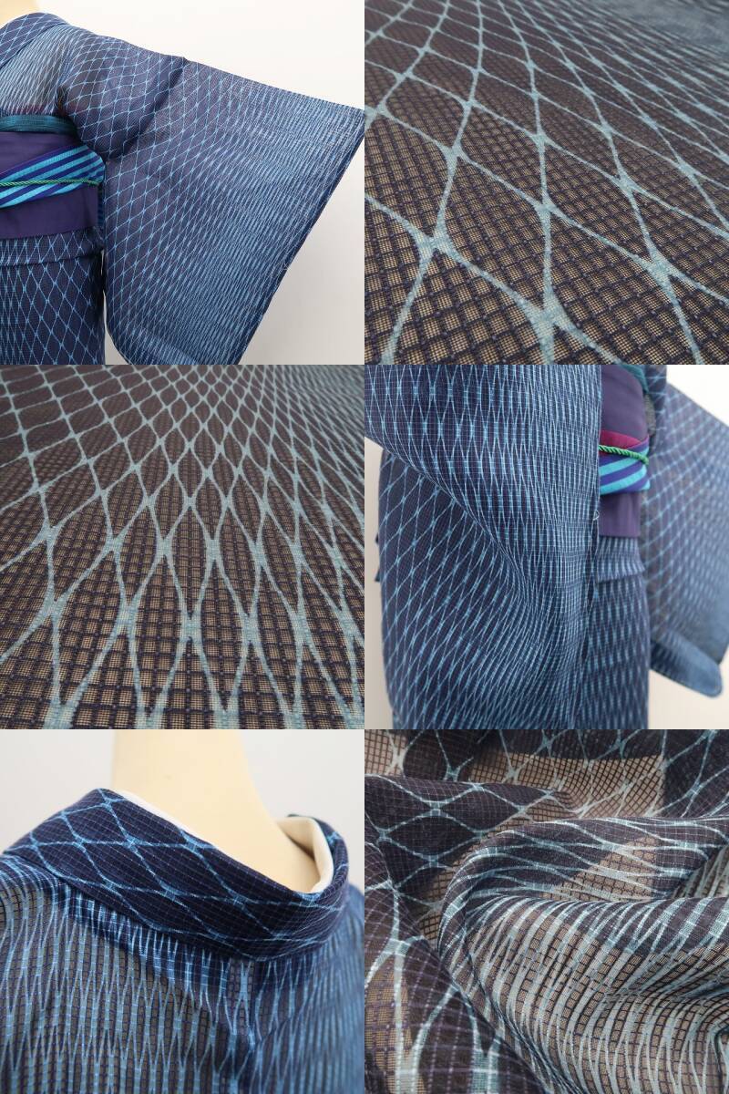 涼しげな紺青色の地を走る縦菱格子のデザインライン、素朴な生地感にヒシクロスが奏でる“今をときめくモダンな色艶”、シンプルにそしてダイレクトに夏着物の魅力を楽しめるひと品、爽やかな涼味に広がるお洒落な空気感…“これぞ!涼を趣く夏風情”、さらりとした綿紅梅の肌触りが貴女に快適な着心地を届けてくれることでしょう。