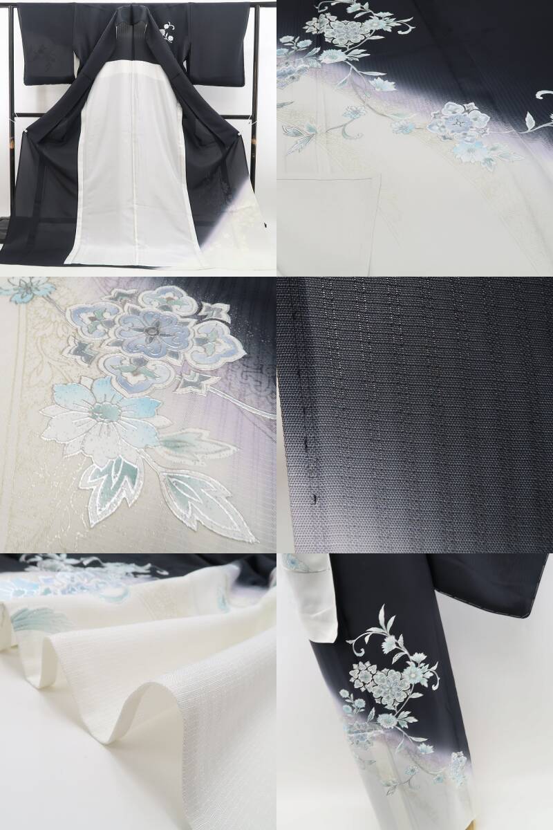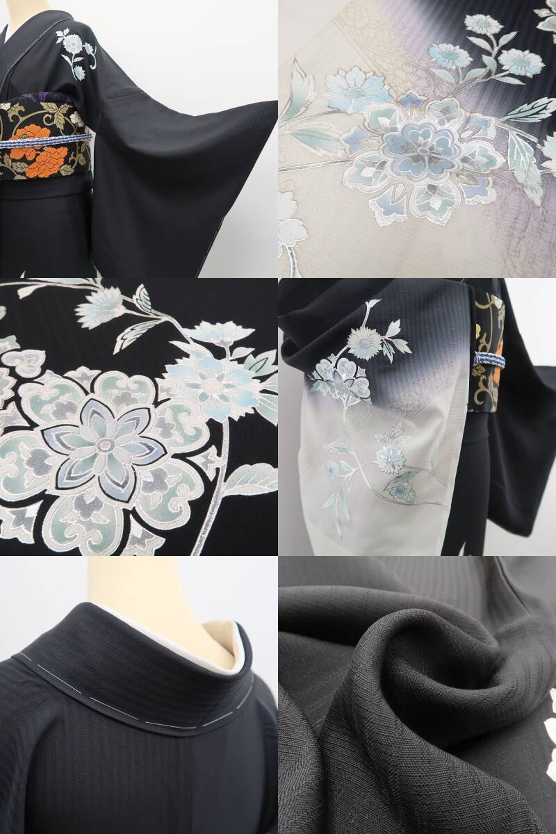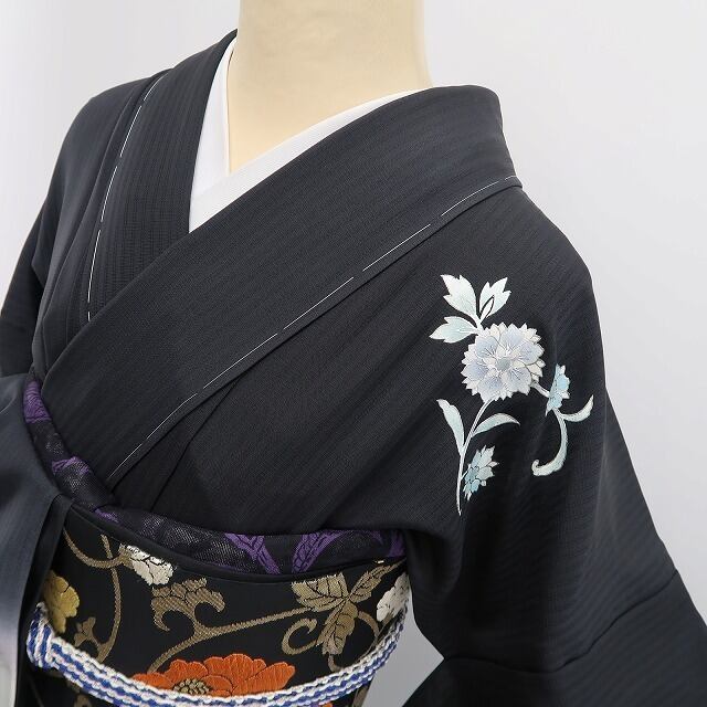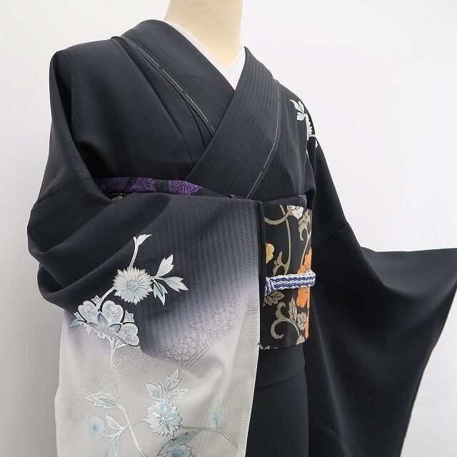 黒の彩色が放つこの上ない大人びた表情、絽の透明感に濃淡の構図で浮かび上がる艶めいた唐花のデザインモチーフ、それは金彩箔に鮮烈なインパクトを残す光彩の世界、金彩友禅の技法が創り出す刺繍のような立体感、彩色の妙に独特の感性が描き出す“美の世界”が極彩の美しさを醸しています。