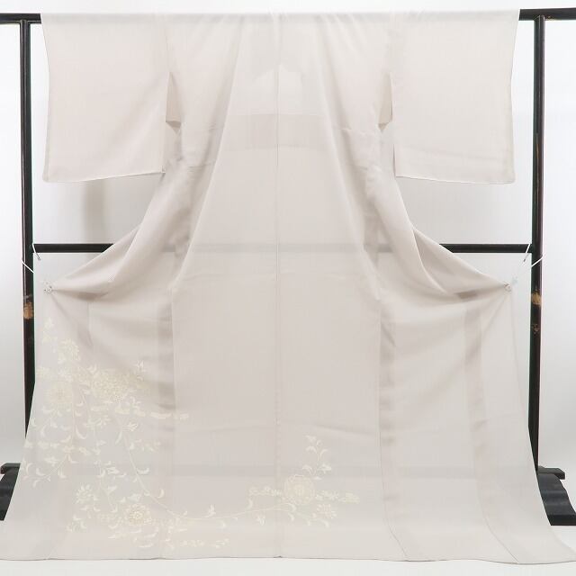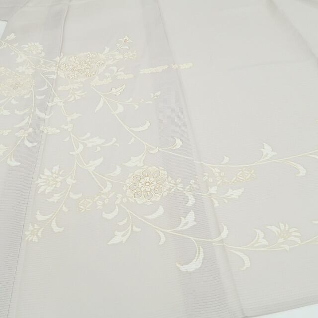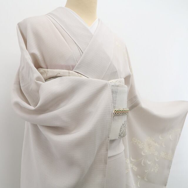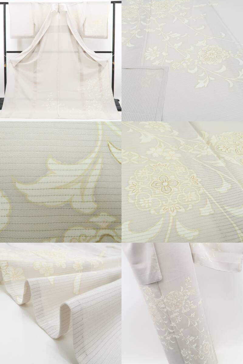 涼やかな素色の彩色が放つ落ち着きの表情、絽の豊かな透明感に浮かび上がるデザイン唐花の流線模様、意匠に醸し出されるえも言われぬお洒落感は必見の価値あり!それは今をときめく創作着物の奥行そのもの、この夏の取って置きはこれで決まり!