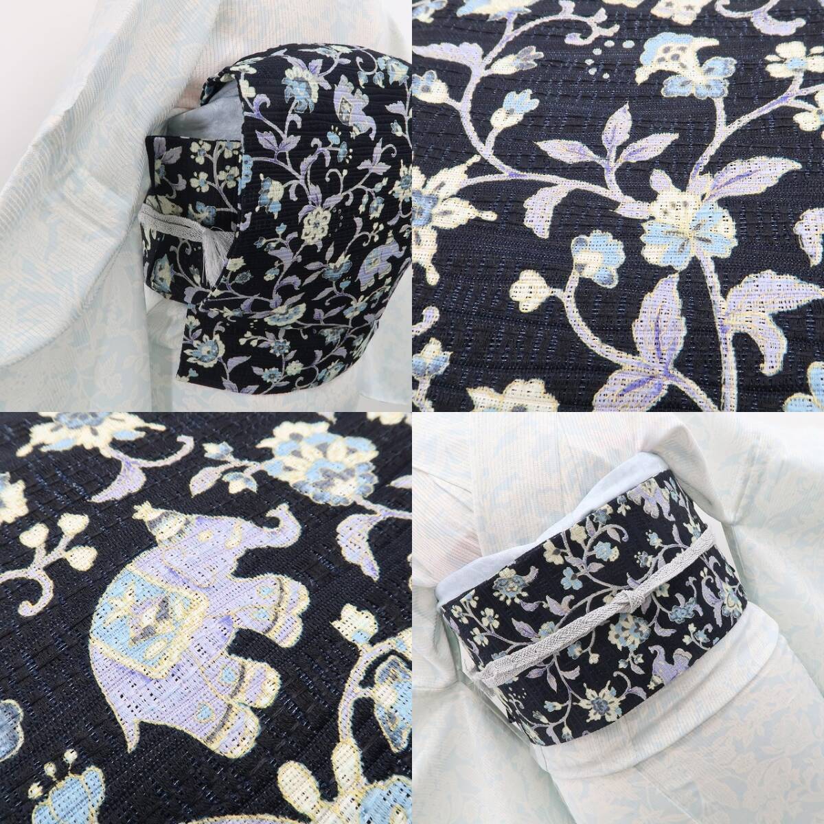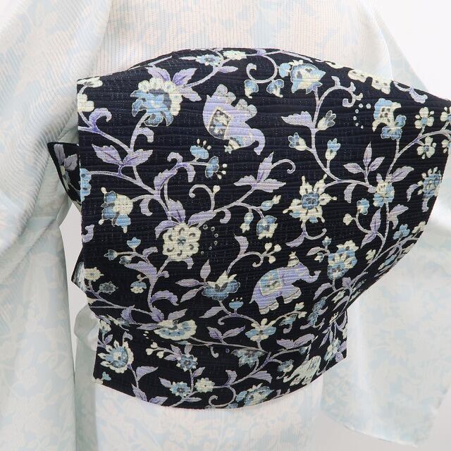 こちらの帯は、夏帯の清涼感に高級感を意識した象更紗の文様を込めております。しっかりと視覚を捉える意匠力は岡重ならでは!誰もが羨望の眼差しで見つめる美しい出で立ち、それはお洒落を愛でる心憎い大人の選択…“お気に入り”として思わず締めたくなること間違いなし。