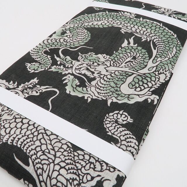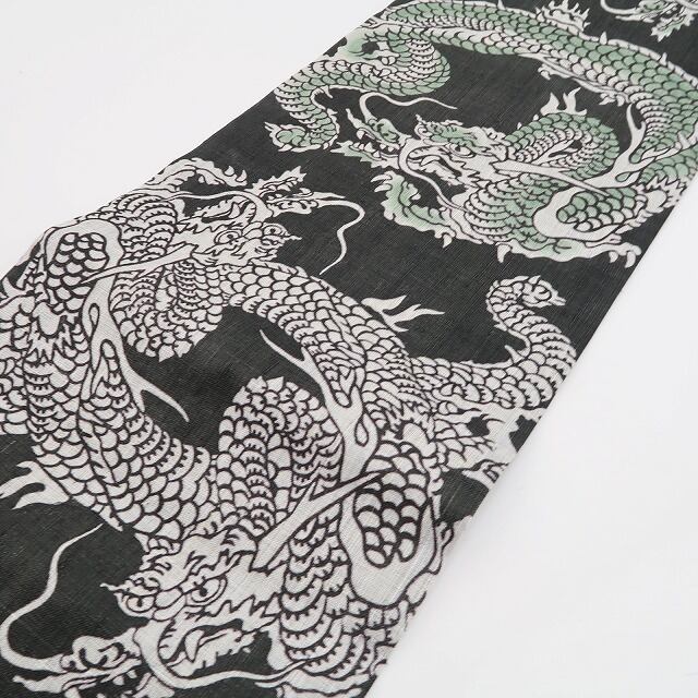 黒緑色の帯地に描き込まれた“異彩を放つ龍の舞”、本麻素材のさらっとした質感に醸し出されるこの上ないお洒落感、それは夏帯の清々しさに巧みな意匠が照らし出す“今をときめく和の色艶”、ダイレクトに装いの楽しさを教えてくれるひと品、これぞ!栗山帯の神髄!見事です。