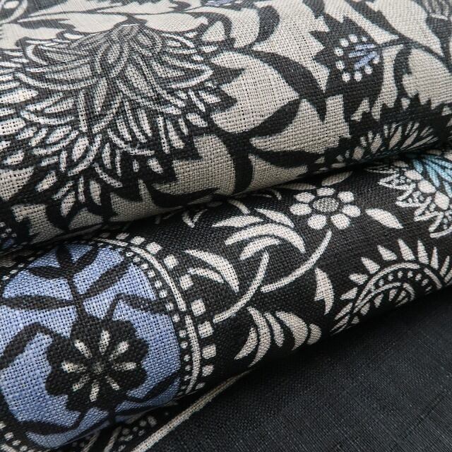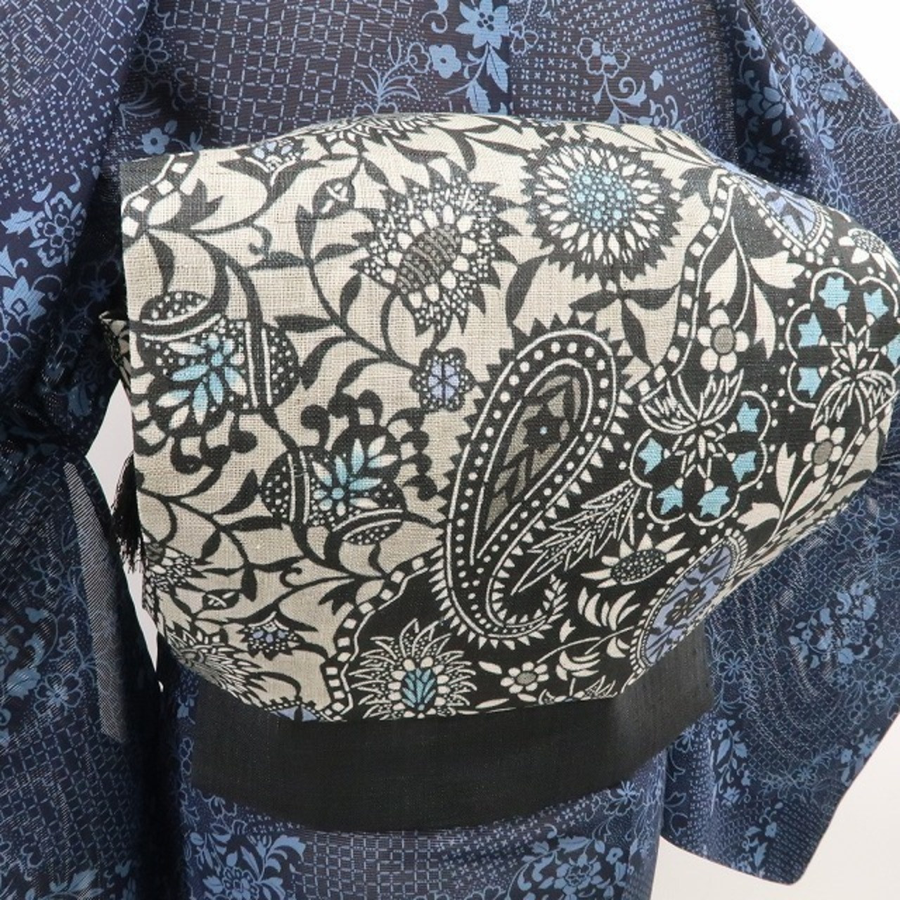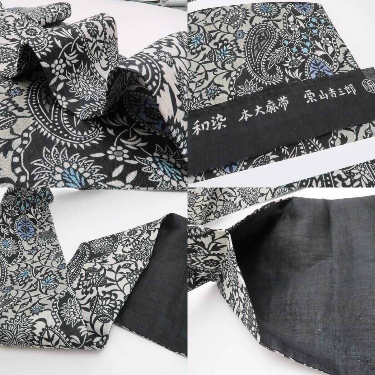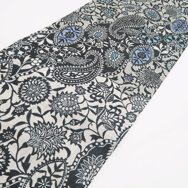 丸みある黒の帯地に広がるこの上ない大人びた艶、全面に浮かび上がる洗練のペイズリー柄、それは“誰もが振り返る帯の余韻”、正に創作帯に潜むハイセンスな個性美、本大麻素材の爽やかな艶に“栗山吉三郎が描き出す和染紅型の世界”、見事!