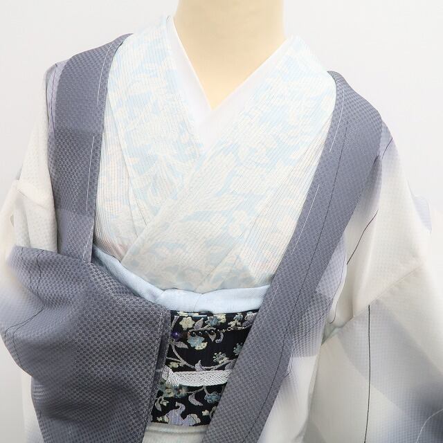 こちらのお着物は、ライトグレイッシュトーンの彩色にモダンな艶を演出するアブストラクトな柄行を込めております。夏着物の透明感とともに嫌みのないさりげないセンスを表現するのに最適なお召し物です。