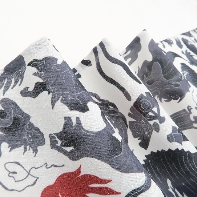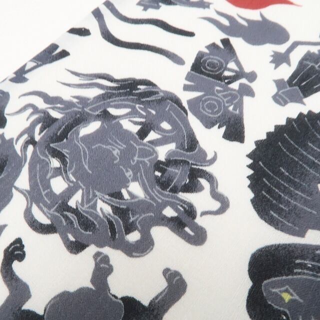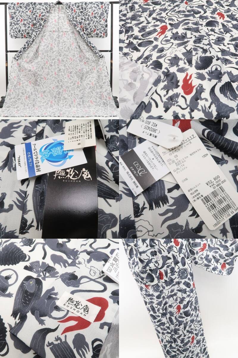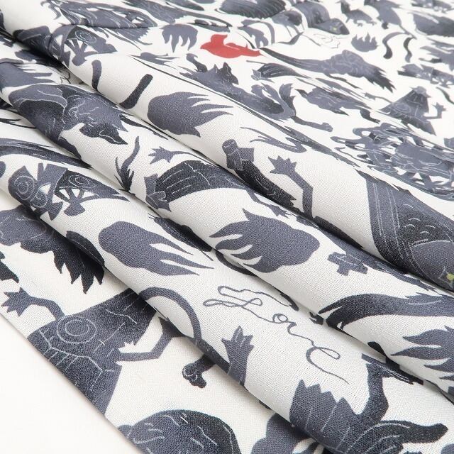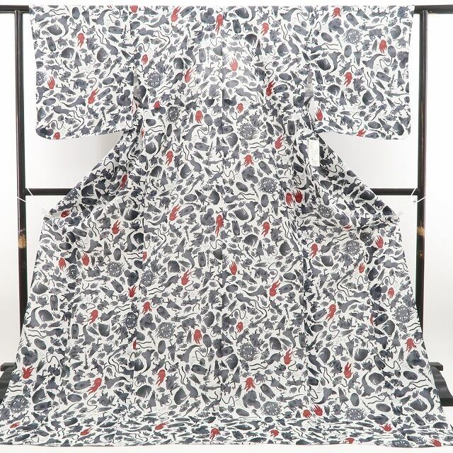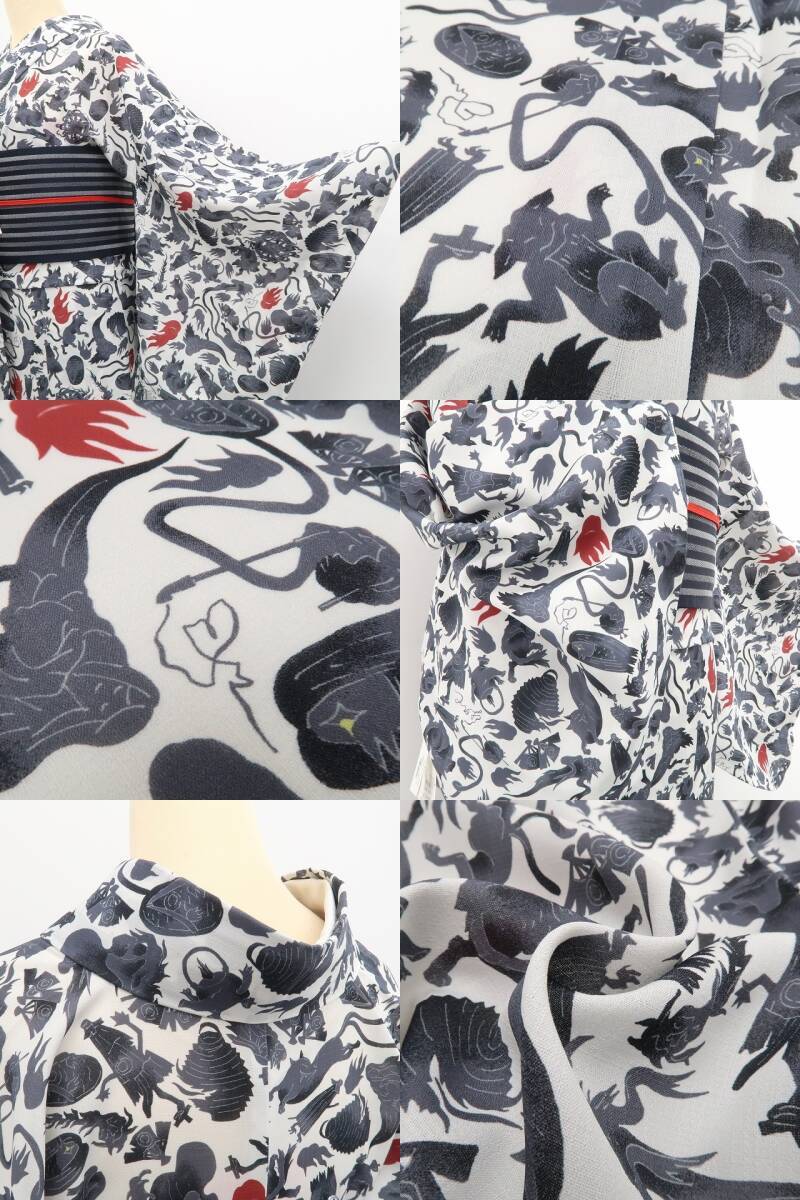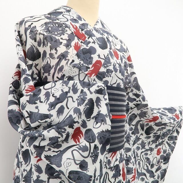 どこかレトロな白磁色に巧みな色使いで一歩控え、一歩前へ出て遠目には草花模様に見え、近づけば、目にも楽しく、ヒヤッとする“妖怪シルエット”がその正体を現し、一瞬でその場の雰囲気を盛り上げ、見る者の体感温度を下げると共に周りと差がつく個性を発揮...撫松庵セオアルファ洗える夏着物仕付け糸付浴衣でございます。