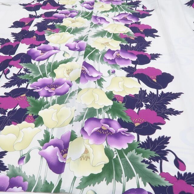 ひらひらとした質感で風に揺れる姿が美しいポピーを片寄せで吹き込み、落ち着きある色付きで影のように一歩控え、少し恥ずかし気に花びらを揺らす麗しい色付きを立て、縦のラインを強調しながらすっきりとした印象をつくり、静かに浮かぶ観世水がさり気なく涼を引き立てる一枚、撫松庵“片寄せポピー”セオアルファ洗える夏着物仕付け糸付浴衣でございます。