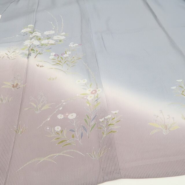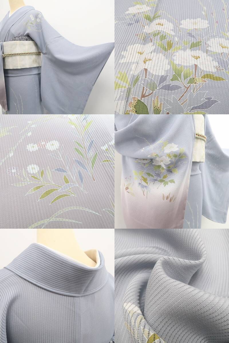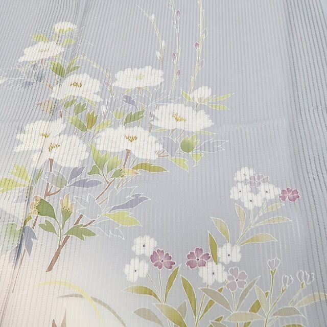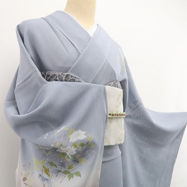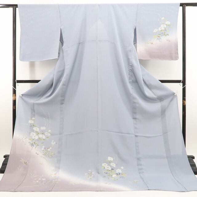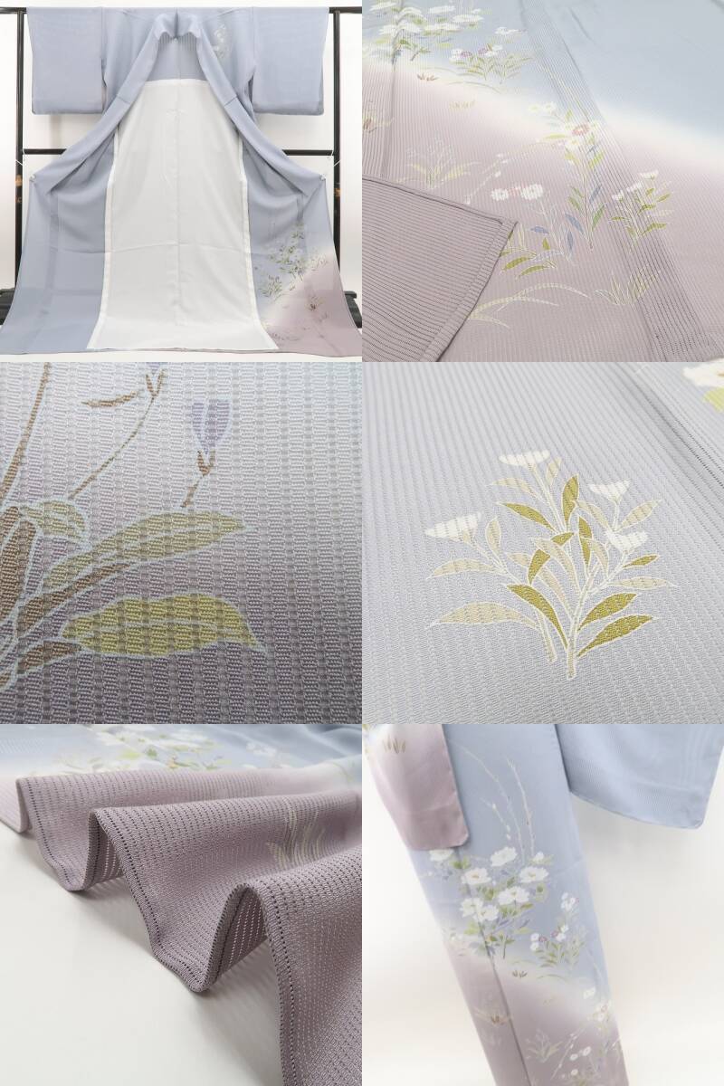淡い群青色×浅紫色でしっとりと時を奏で、縦縞のように広がる絽の透け感で涼を打ち、自然体が美しい花々で歓び溢れる風情を花開き、夏のフォーマルシーンに華を添える、“縦絽”手描き友禅夏着物正絹仕付け糸付トールサイズ訪問着でございます。