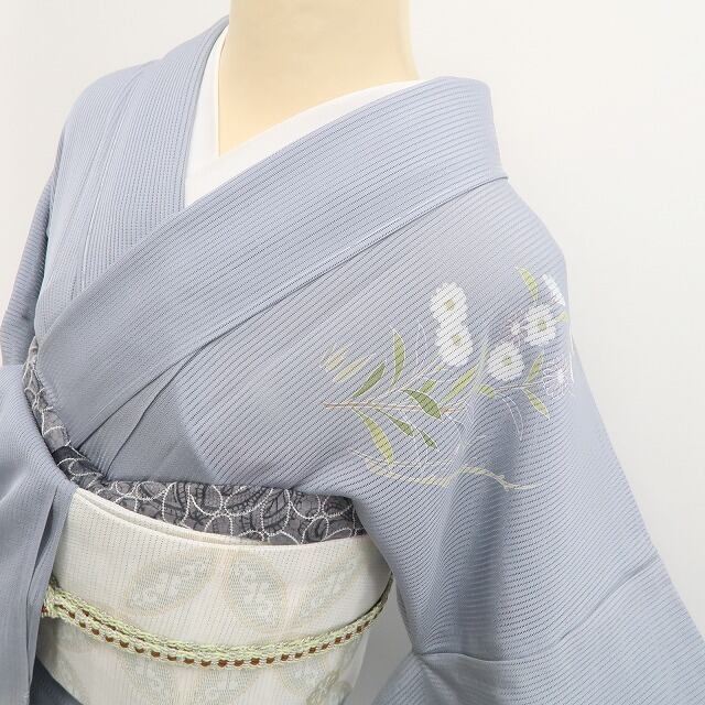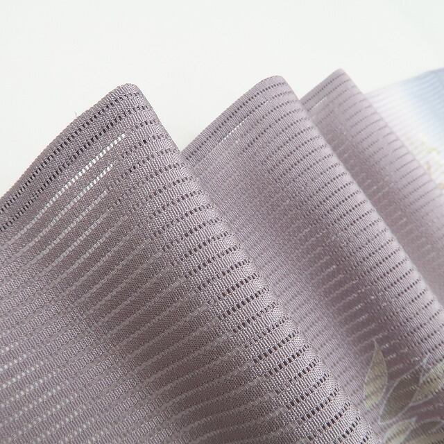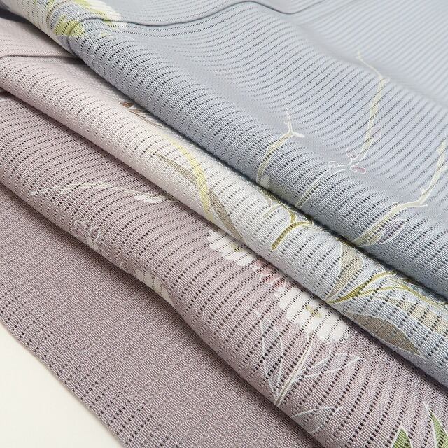 7月、8月の盛夏に最適で、まだまだ気温の高い初秋頃まで活躍する薄物着物の代表格“絽”は、縦糸と横糸をからませて織った生地で“絽目”と呼ばれる目の細かな透かしを持ちます。絽目が横向きになっているものを「横絽」、こちらのように縦向きになっているものを「縦絽」といい、絽の中にも種類があります。
