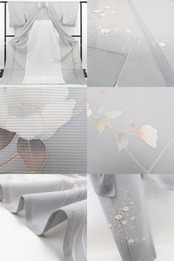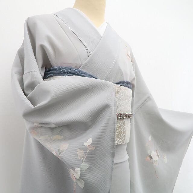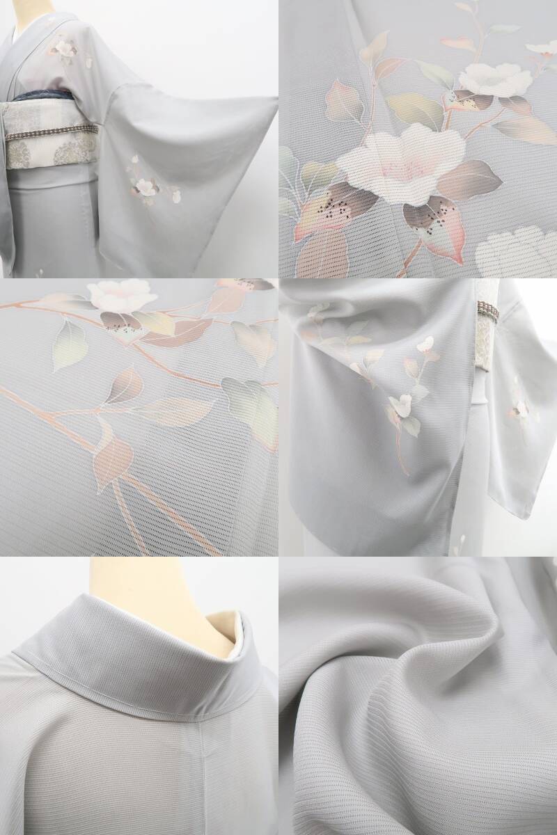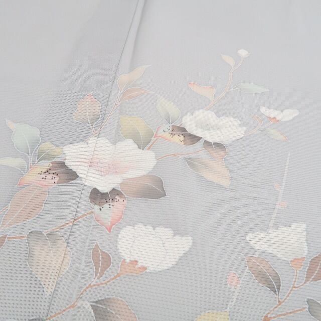 絽の透け感で生み出す目にも涼し気なグレーの夏霧は、優しい色や虫食いの葉、今か今かと開花を待つ心の高鳴り、そして無垢な笑顔を花開いて自然体で枝を振る夏椿をそっと見守り、無地場が物語る心の余白と共にその美しさを引き立て、袖を通せば、貴女を涼やかにもてなしてその美しさを引き立てそっと寄り添う、トールサイズのお仕立て上がり品夏着物。