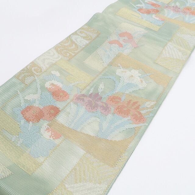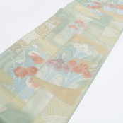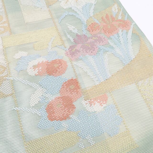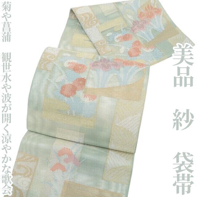 美品 紗 夏着物 正絹“菊や菖蒲、観世水や波が開く涼やかな歌会”袋帯 6240