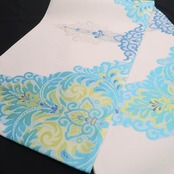 均一に透ける素材で通気性の良い“紗”は、緯糸を一本打ち込むごとに二本の経糸を交差させるもじり織で、細かい隙間が表れ、絽以上に透け感を持ちます。その紗の涼味と始まりを運ぶ白に映え、爽やかな薫りに幸せを予感させる色で花開く唐花は、ゴージャスなティアラとなってその始まりの日を最上に飾ります。