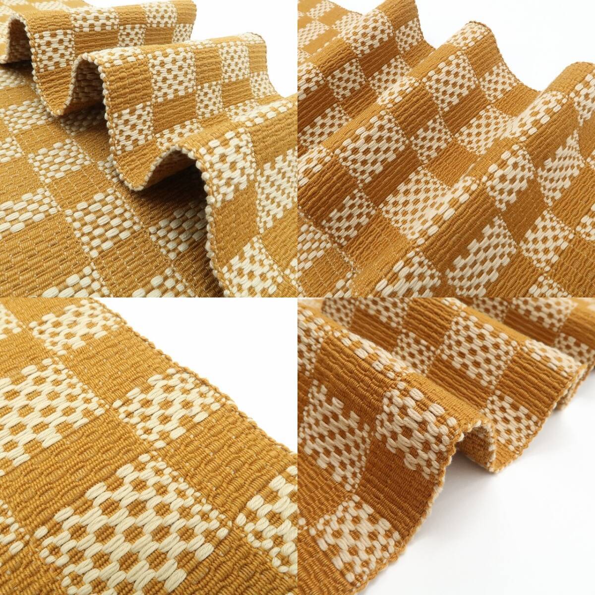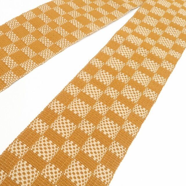 温かみや落ち着きを感じる黄橡色、手織りならではの温もりある人の手を伝い生み出されるご覧の市松は、そっと触れたくなる立体感ある味を交互に浮き立て、定番柄の一つを独自の美しさで表現、新たな定番を生み出し、カジュアルな装いを特別なものへと演出する、南風花織手織り“市松”半幅帯でございます。