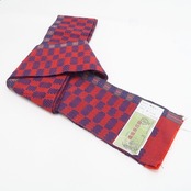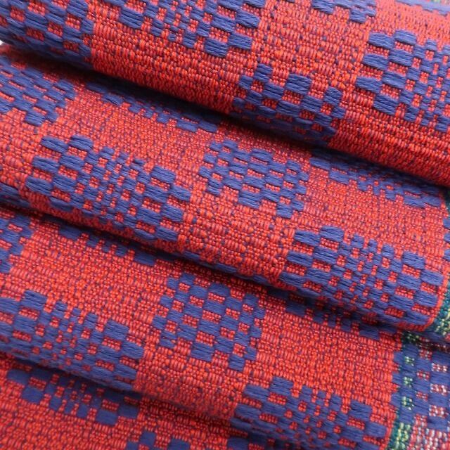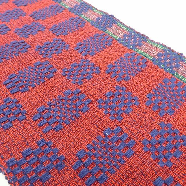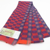 温かみや落ち着きを感じる赤×紺色、手織りならではの温もりある人の手を伝い生み出されるご覧の市松は、そっと触れたくなる立体感ある味を交互に浮き立て、定番柄の一つを独自の美しさで表現、新たな定番を生み出し、カジュアルな装いを特別なものへと演出する、南風花織手織り“市松”半幅帯でございます。