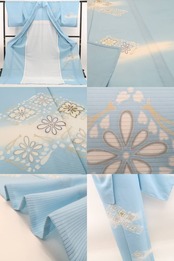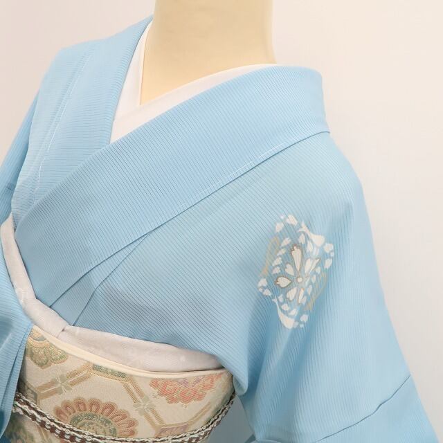 澄んだ空気をまとうような薄藍色の絽に、菊菱文様が浮かび上がる一枚。
