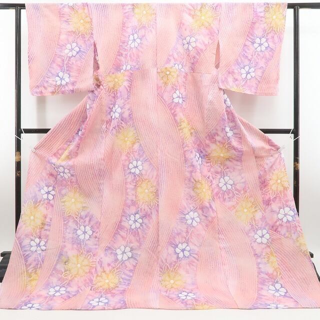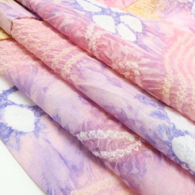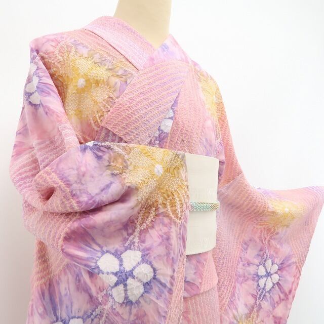撫子色のやさしい地に浮かぶ、絞りで咲かせた可憐な花々……