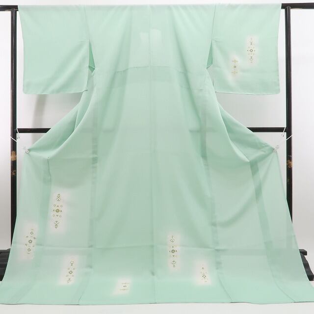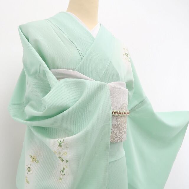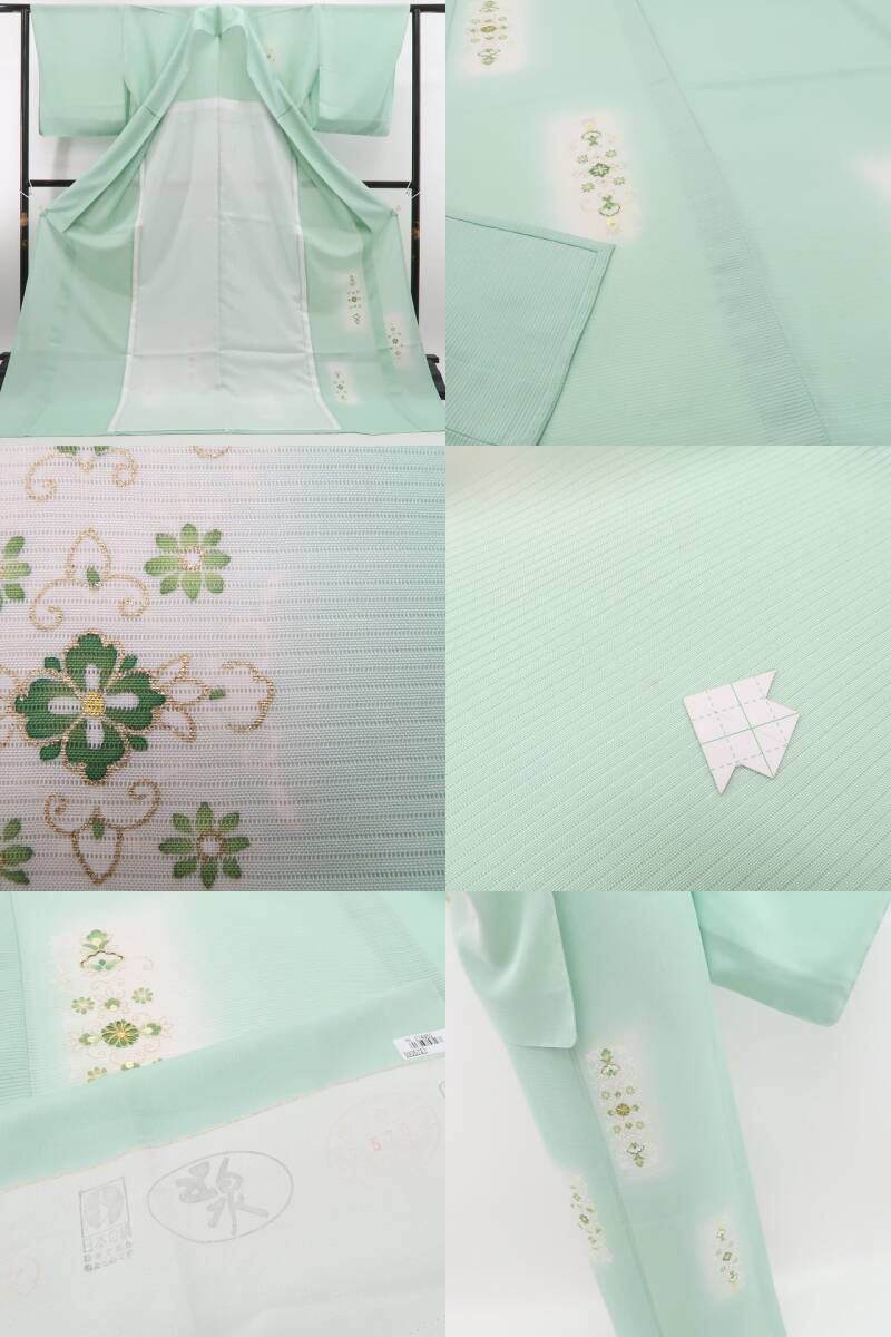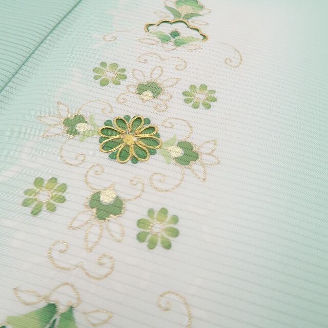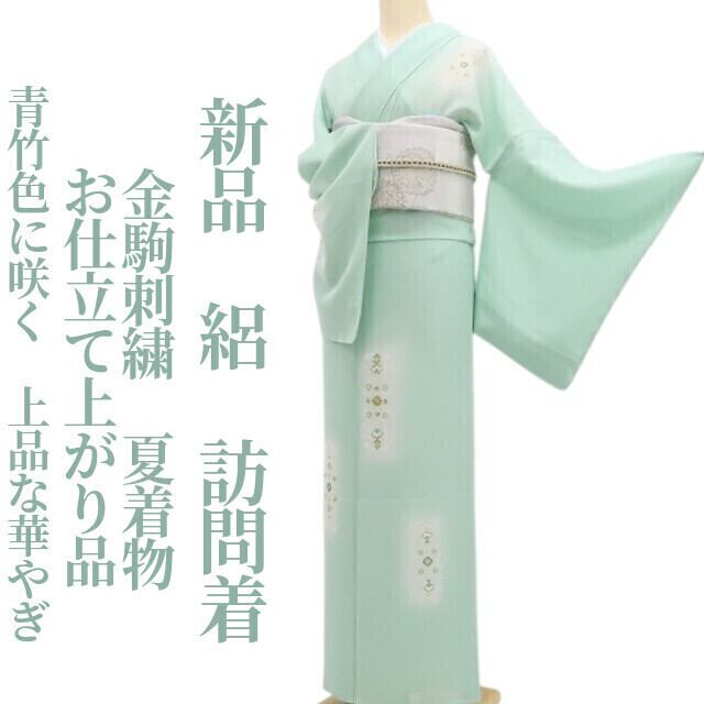 新品 絽 金駒刺繍 お仕立て上がり品 夏着物 正絹”青竹色に咲く、上品な華やぎ”仕付け糸付 訪問着 6271