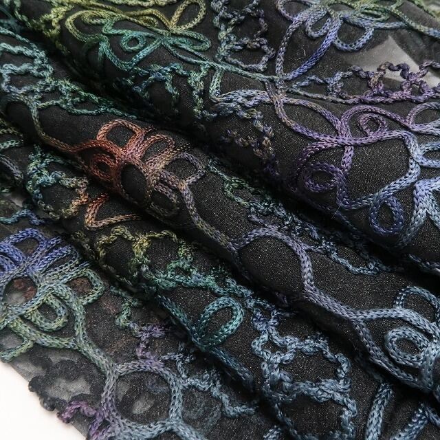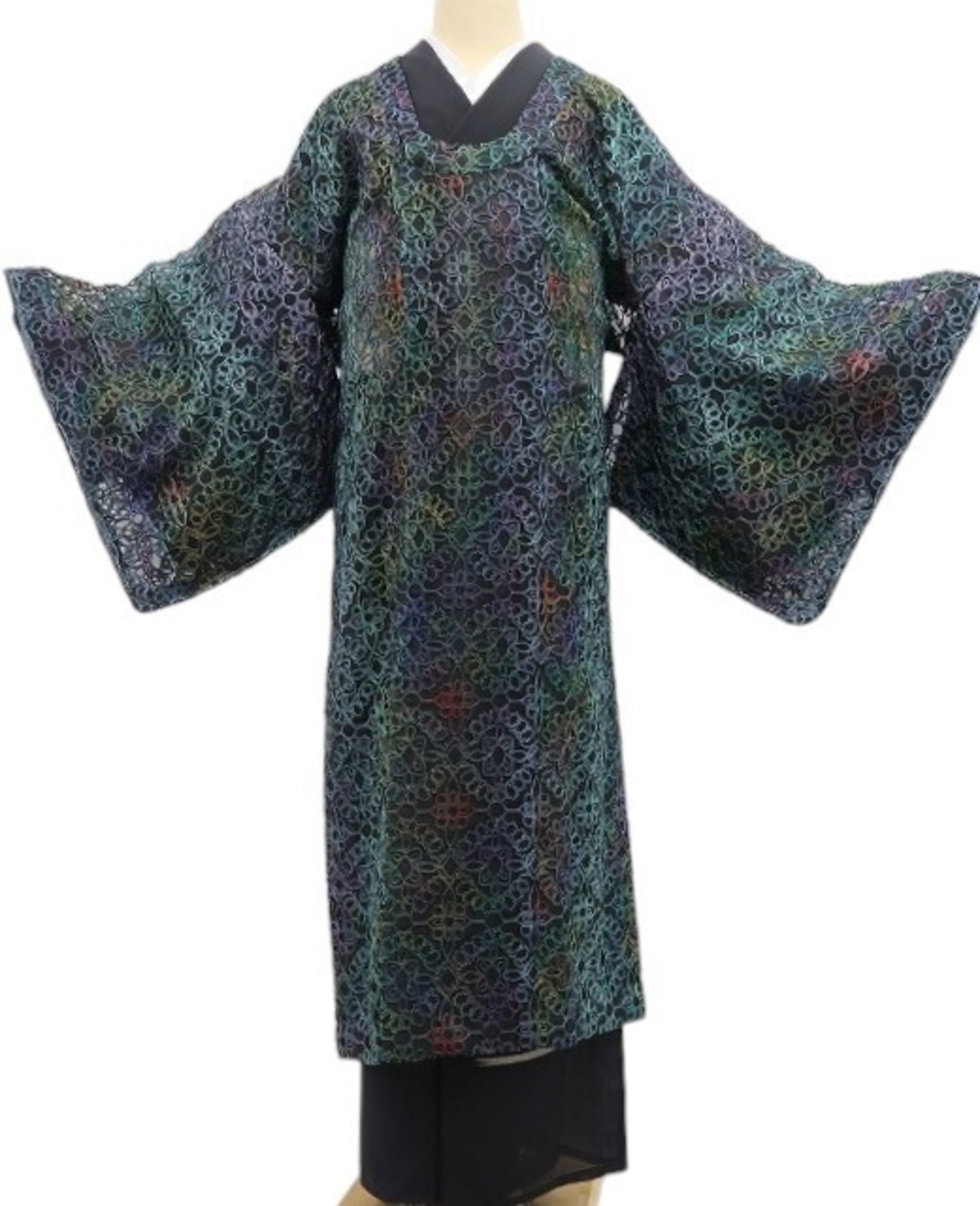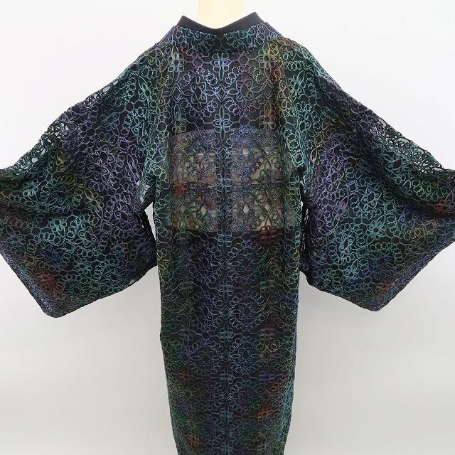 一瞬、時が止まる感覚でうっとりしてしまう黒×多彩に開かれるオーガンジーの透け感、光の下でも影になってもその自然味溢れ、品があり、華やかさも持ち、どこか神秘的に薫る美しさを際立たせる極彩は、整然と自然味溢れる七宝を繋ぎ、花菱となり、素敵なお着物と重なってまた違う表情を生む、“ オーガンジー”刺繍正絹仕付け糸付ロング丈道行コートでございます。