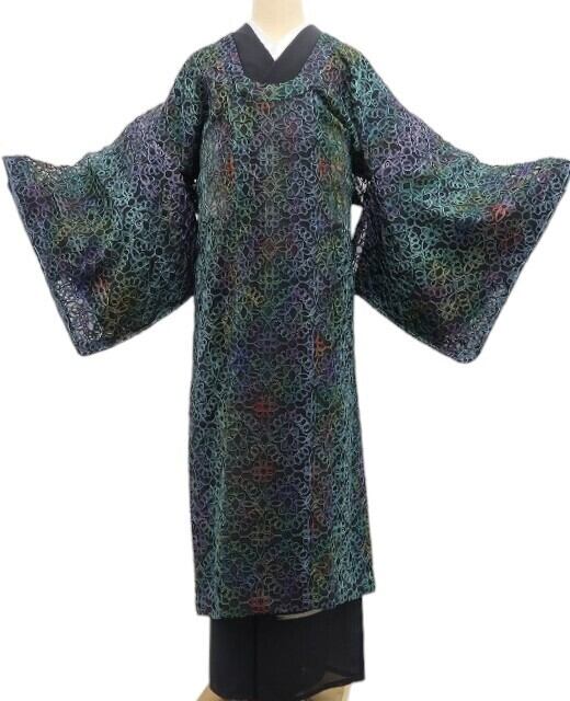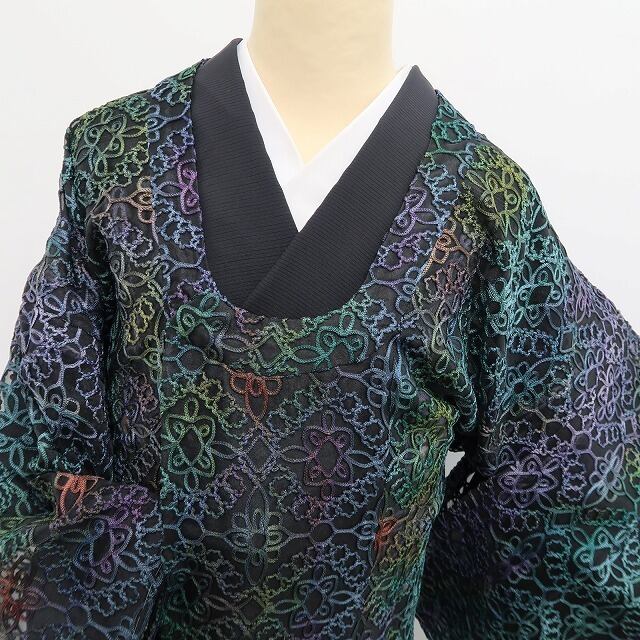 高級感があり肌当たりの良い正絹素材、ロング丈ですので安心してお着物を預けられ、ベースが黒ですのでコーディネートもしやすく、浮き立つ極彩美も道中に素敵な華を添えます。