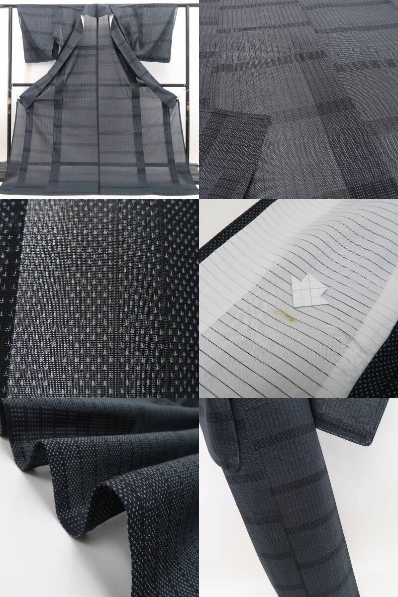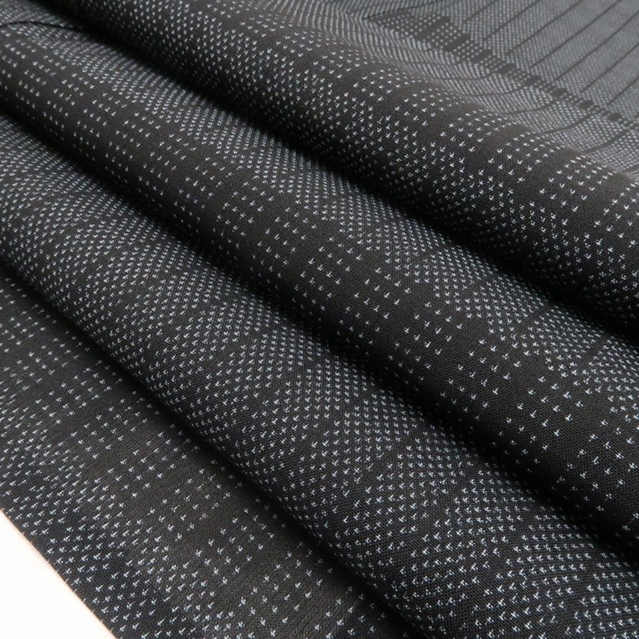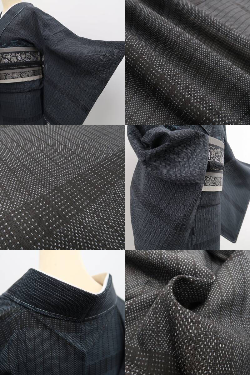 鉄御納戸色の落ち着いた地に、織り柄で縦縞色の濃淡がさりげなく浮かぶ一枚。