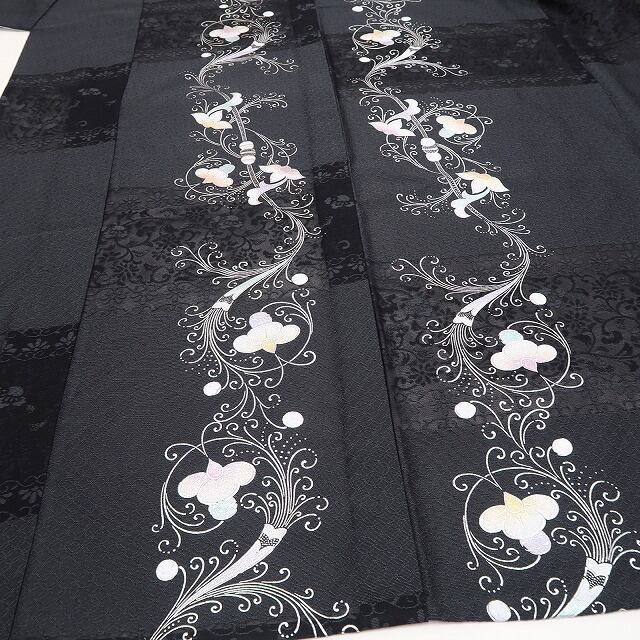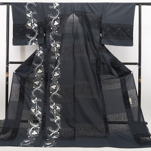 黒×グレーで開かれる匠の世界は、紋紗ならではの美しい透け感に繊細で優美な七宝、唐花や菊が静かに静かに鼓動を響かせ、燦然とした美しさで曲線的に翔け上がり、遠目にも視線を奪う特別な華で美技と妙なる意匠を解き、見れば見るほど惹きこまれ、感動を覚える芸術となる。袖を通し、鏡に映る自らの美しさにまた感動を覚えることでしょう。
