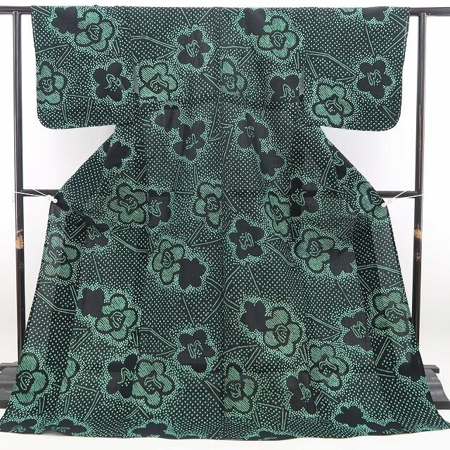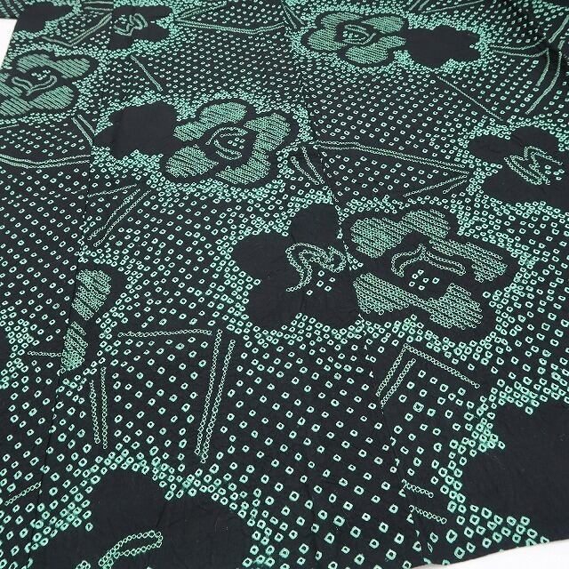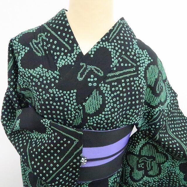 新品 有松鳴海絞り 夏着物 綿 仕付け糸付”黒と緑の絞りが描く、夏の異彩”高級浴衣 6297
