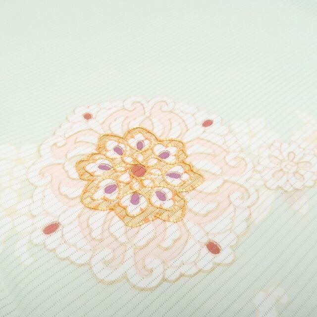目にした瞬間、体感温度を下げそうな絽ならではの透け感を広げる裏葉柳色が夏嵐となり、優しい色付きで花道をつくる唐花の駆け足、自然味と品格溢れる美しさを金駒刺繍で華麗に飾った華文を普段とは違う扉を開く慶びの場所へと送り出す。