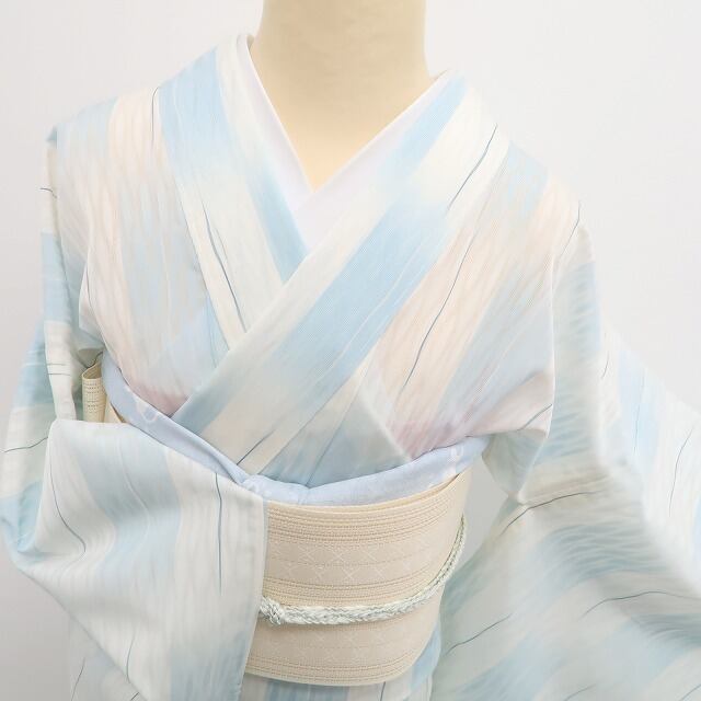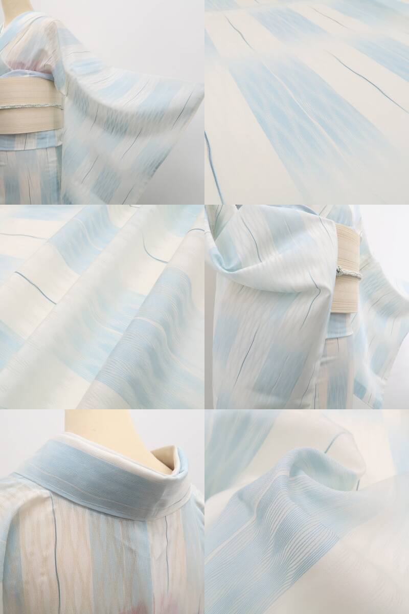 生成り色と浅縹色の彩色に広がる縮地の心地よさ、夏着物の透明感に濃淡を描くお洒落格子の市松デザイン、涼を趣くその表情は…伝統の技が創り出す創作ちぢみの新しい風、季節の装いに…さらりとした極上の肌触りをどうぞ心ゆくまでお楽しみください。