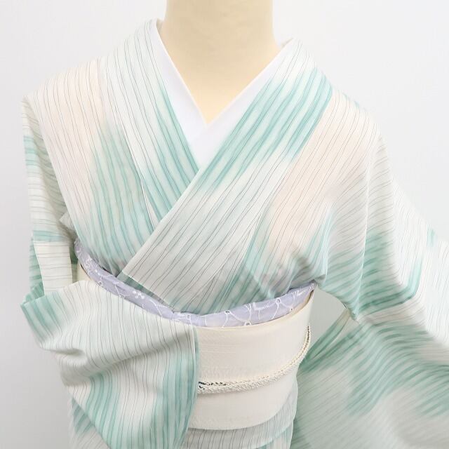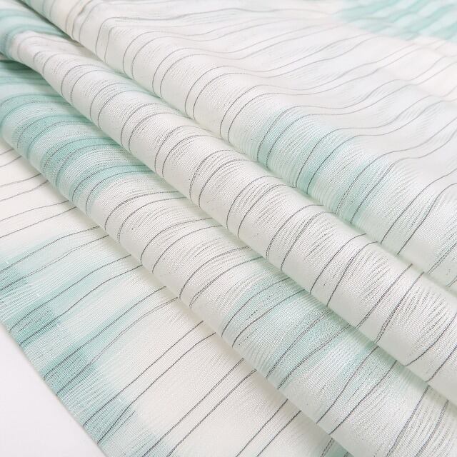生成り色と青碧色の彩色に広がる縮地の心地よさ、夏着物の透明感に濃淡を描くお洒落モダンな創作デザイン、涼を趣くその表情は…伝統の技が創り出す創作ちぢみの新しい風、季節の装いに…さらりとした極上の肌触りをどうぞ心ゆくまでお楽しみください。
