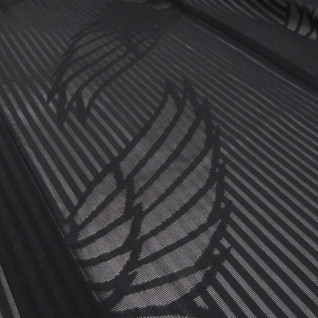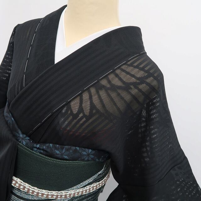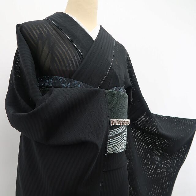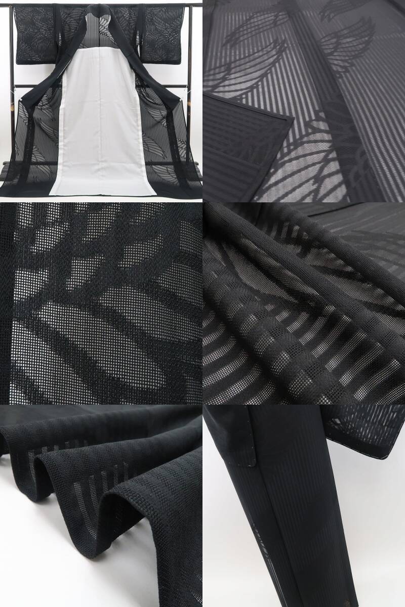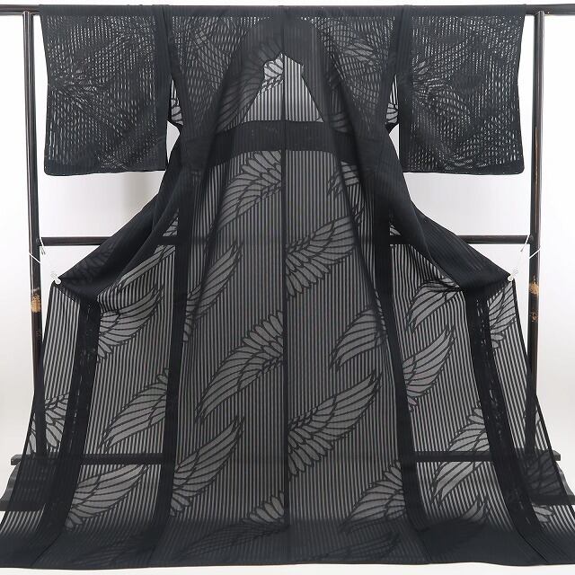 深みある黒の彩色が誘うこの上ない大人びた表情、全面に艶めいて浮かび上がる羽文様のデザインモチーフ、それは紗の透明感に涼を挿す巧みな意匠の美しさ、正に今をときめく創作着物の奥行そのもの…柄行のシルエットが創り出す謎めいた視覚のインパクト、素敵です。