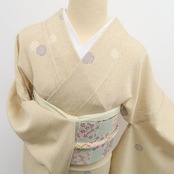 時々擦れたような味で縦横に粋を奏でる飾らない和心と絽が奏でる透け感で満ちる蒸栗色にシルエットを預けて飛び出す雪輪は、あたたか味と共に雪の結晶を思わせる姿でさり気なく涼を増すお手伝いをしながら飾らないその雰囲気に華を齎し躍動を生み、自慢の絞り柄を披露。預けたシルエットには、横縞のように広がる絽の魅力が活きております。