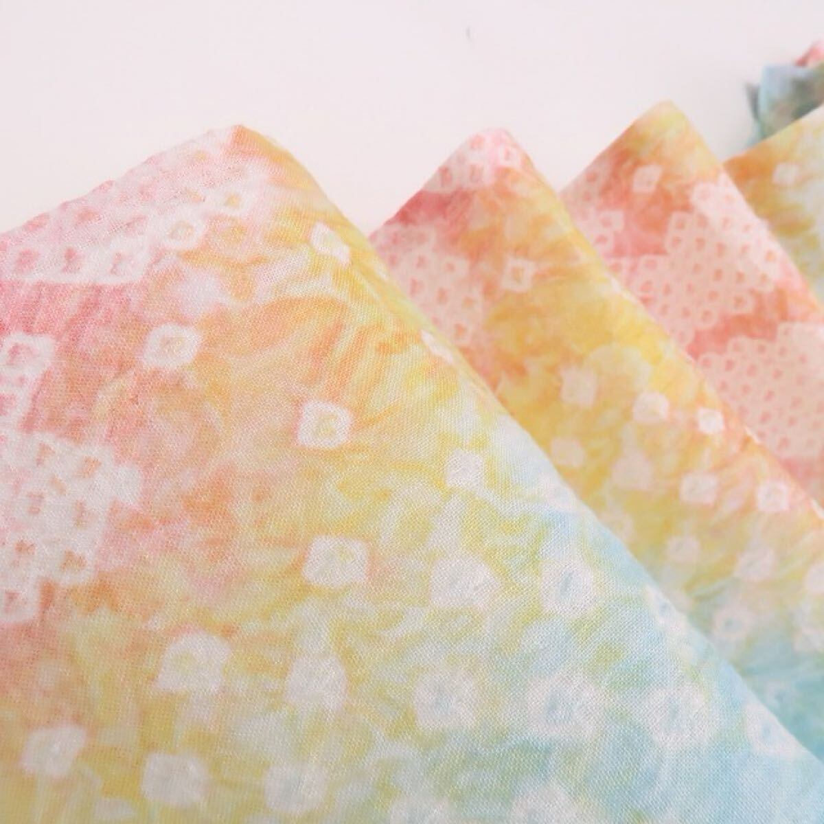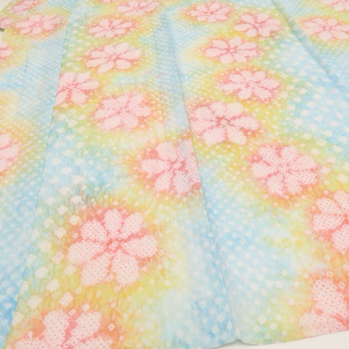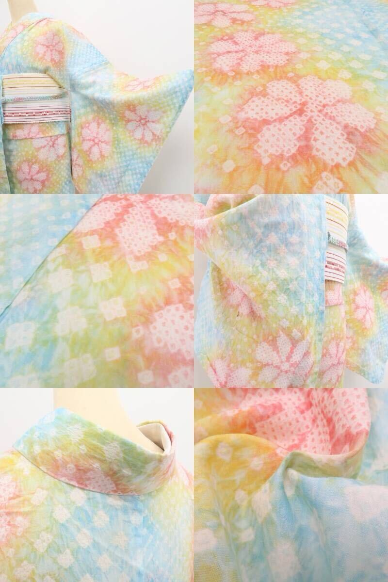 淡く透きとおるような地色に、絞りの技法で描かれた花々が軽やかに舞い、まるで風とともに揺れているかのような優雅な一枚。見ているだけで、心がすっとほどけていくような、やさしい夏の景色を映します。