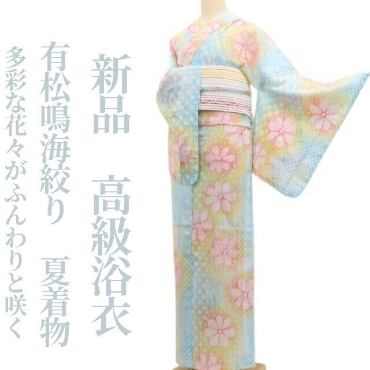 新品 有松鳴海絞り多彩な花々がふんわりと咲く夏着物 綿 仕付け糸付 高級浴衣 6355