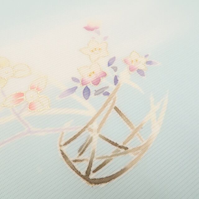 涼風を思わせる白群色に、花々が絶妙な構図で描かれた一枚。
