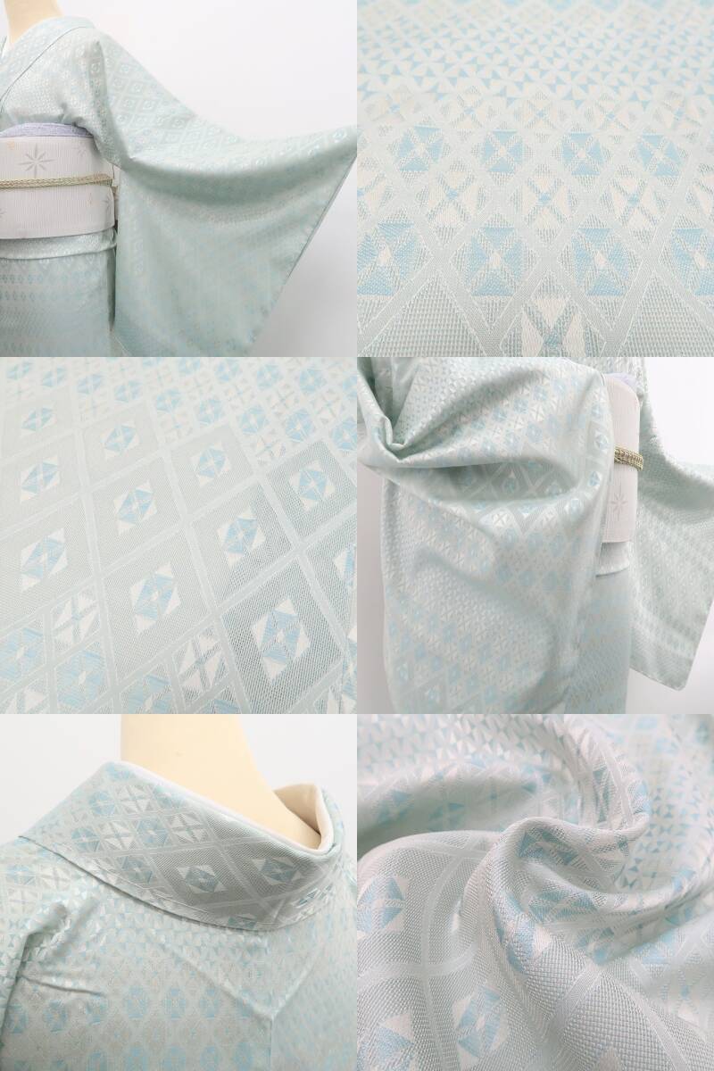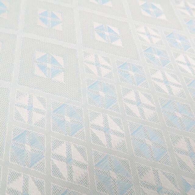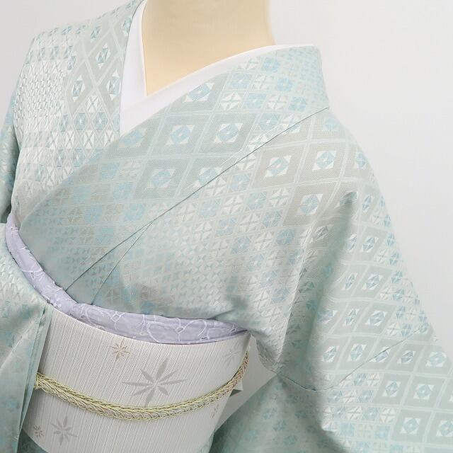 丸みを帯びた水浅葱色の地に横段状の構図で浮かび上がるデザイン和柄の組み模様、紋紗の透明感に巧みな意匠が醸し出す洗練の風…手くくり手摺り込みによる絣糸を一本一本合わせながら織り上げるお召の味わい、独特のしっとりとした風合いが着物の味わいを一段と馴染みやすい趣に変えています。