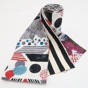 裏面はさらに個性的。左右非対称の柄になっており、片側にはクラシカルなストライプ、もう片側には赤やグレーを基調としたモダンなドットやストライプの模様が。
