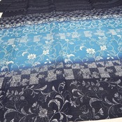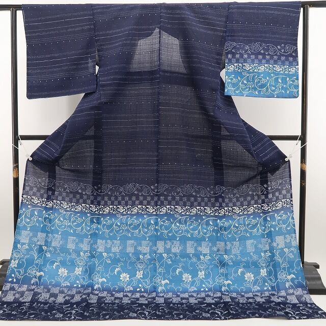 鉄紺色と藍色の色味に広がる清々しい紬の素材感、紗の豊かな透明感に横段状の構図で描き込まれたデザイン唐花の色模様、それは正に丁寧に紡がれた手座繰りの真心、民芸創作品ならではの豊かな温かみが魅力の一枚、受け継がれる伝統赤城紬の味わいを存分にお楽しみいただけます。